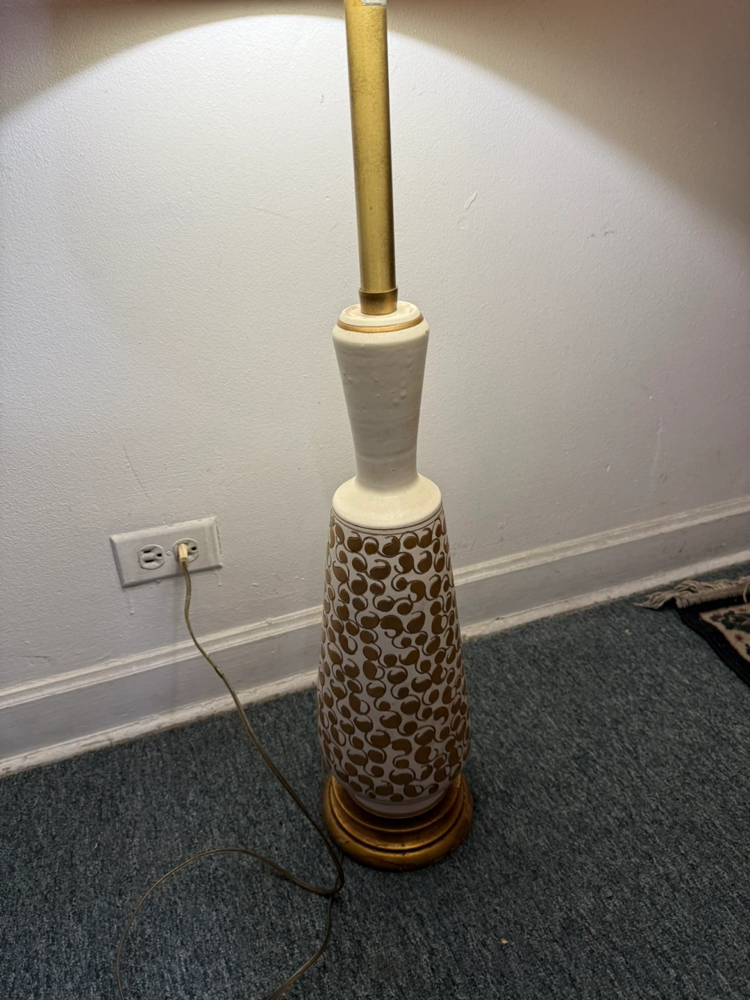 Here's a stylish vintage-inspired table and floor lamp! It features a textured tan shade and a decorative base with a gold and white pattern. It would be a great addition to any room!
