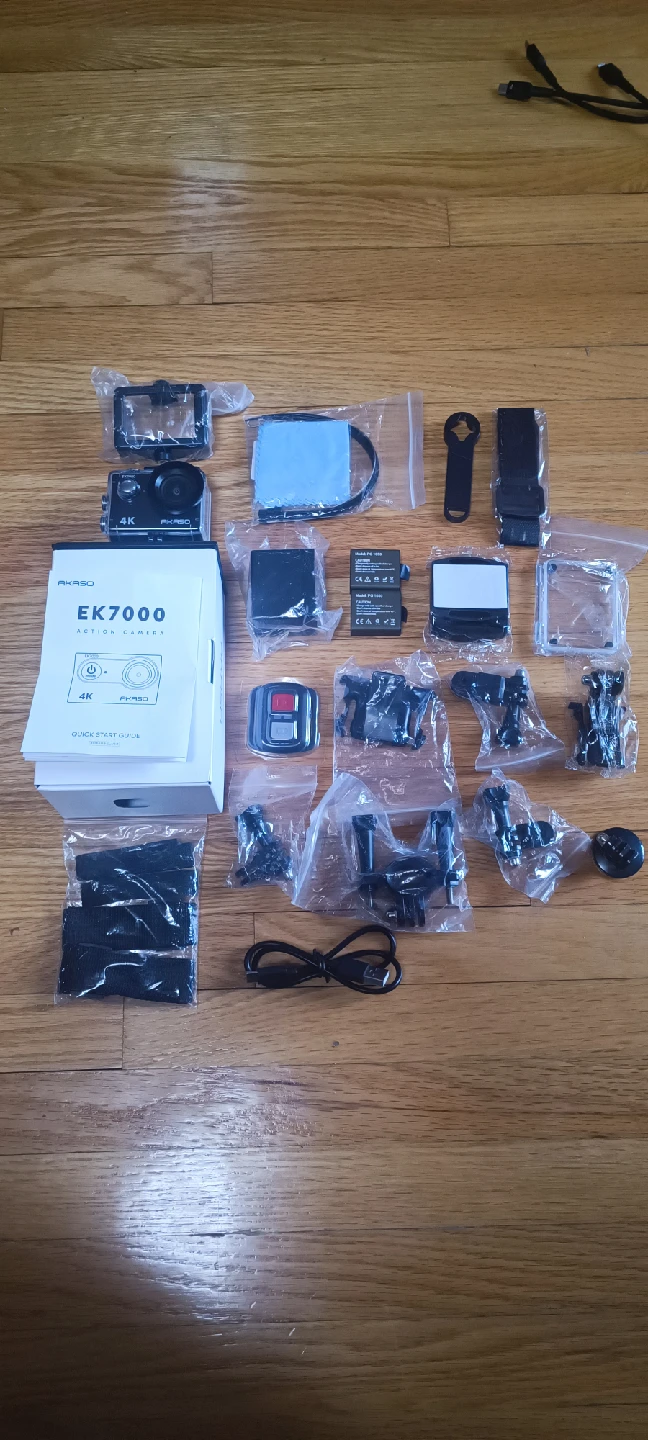 Selling an AKASO EK7000 4K action camera in excellent condition! It comes with the original box and all the included components and accessories. It's waterproof up to 131ft, perfect for any adventure! (Product comes with 3 batteries)