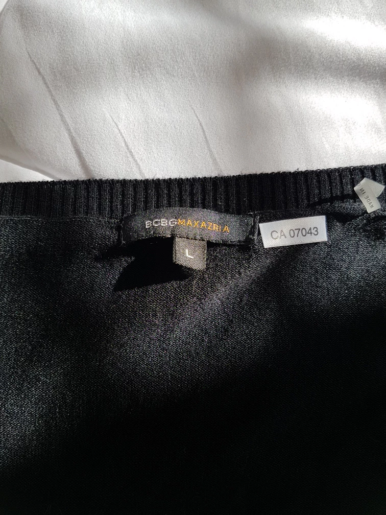 This is a BCBGMAXAZRIA black dress in size L. It's in great condition and would be a lovely addition to your wardrobe! It features a V-neck and cap sleeves.