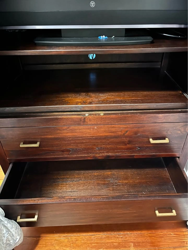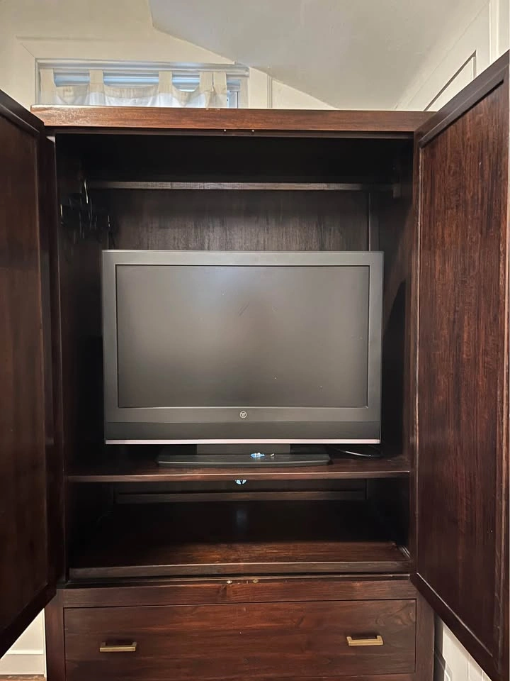 Like new solid wood armoire from crate and barrel. This armoire has two drawers, a hanging clothes bar and two additional shelves not pictured. Measures 40” wide, 74” tall, 22 3/4” deep. Really great piece of furniture, we just don’t have room for it. This is HEAVY you must be able to move down about 5 stairs to get out of the house. TV not included.