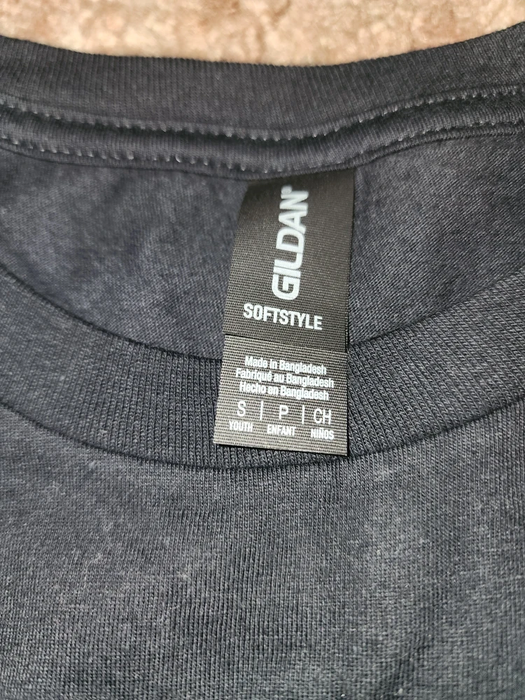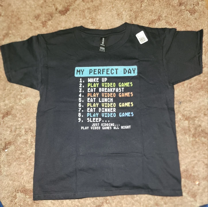 This is a Gildan youth size small black t-shirt. It features a fun design that says 'My Perfect Day' with a list of activities including playing video games, eating breakfast, lunch, and dinner, and sleeping. It's a great shirt for any young gamer!