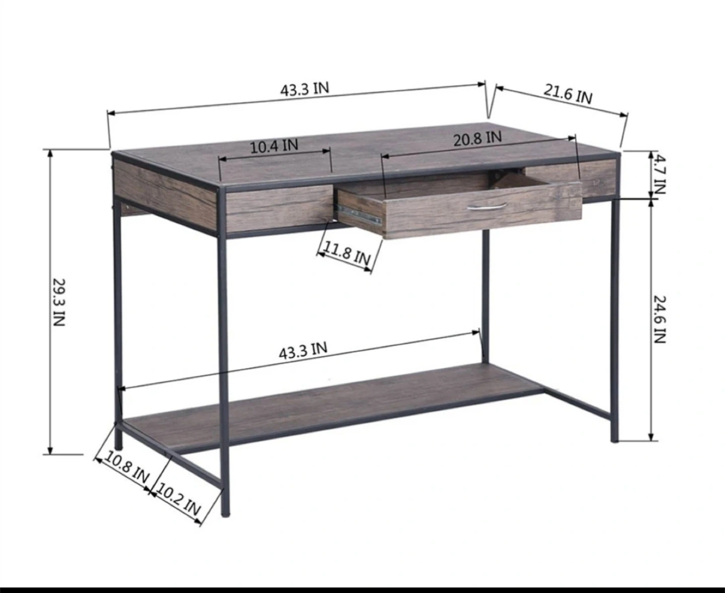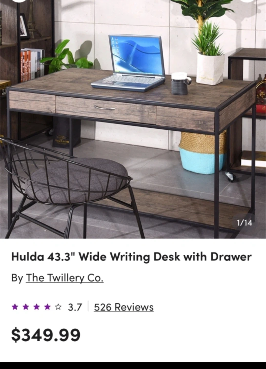Selling a Hulda 43.3" wide writing desk with a drawer by The Twillery Co. This desk is perfect for a home office or study space. It features a rustic woodgrain finish with a sturdy metal frame. Dimensions are approximately 43.3 inches wide, 21.6 inches deep, and 29.3 inches high.