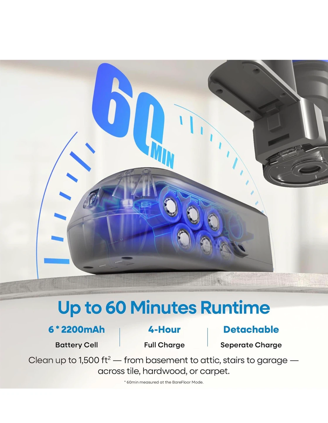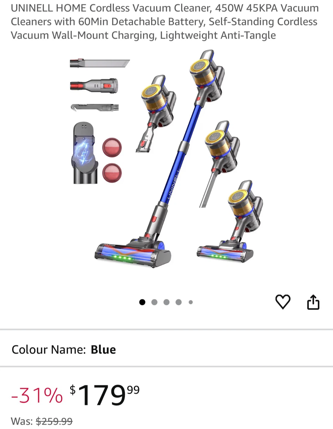 I'm selling a UNINELL HOME Cordless Vacuum Cleaner. It features a 450W motor and 45KPA suction power. It also has a 60-minute detachable battery. The vacuum is self-standing and comes with a cordless wall-mount charging station. It's lightweight and anti-tangle. Grab-and-go convenience, perfect for mid-task breaks and seamless storage