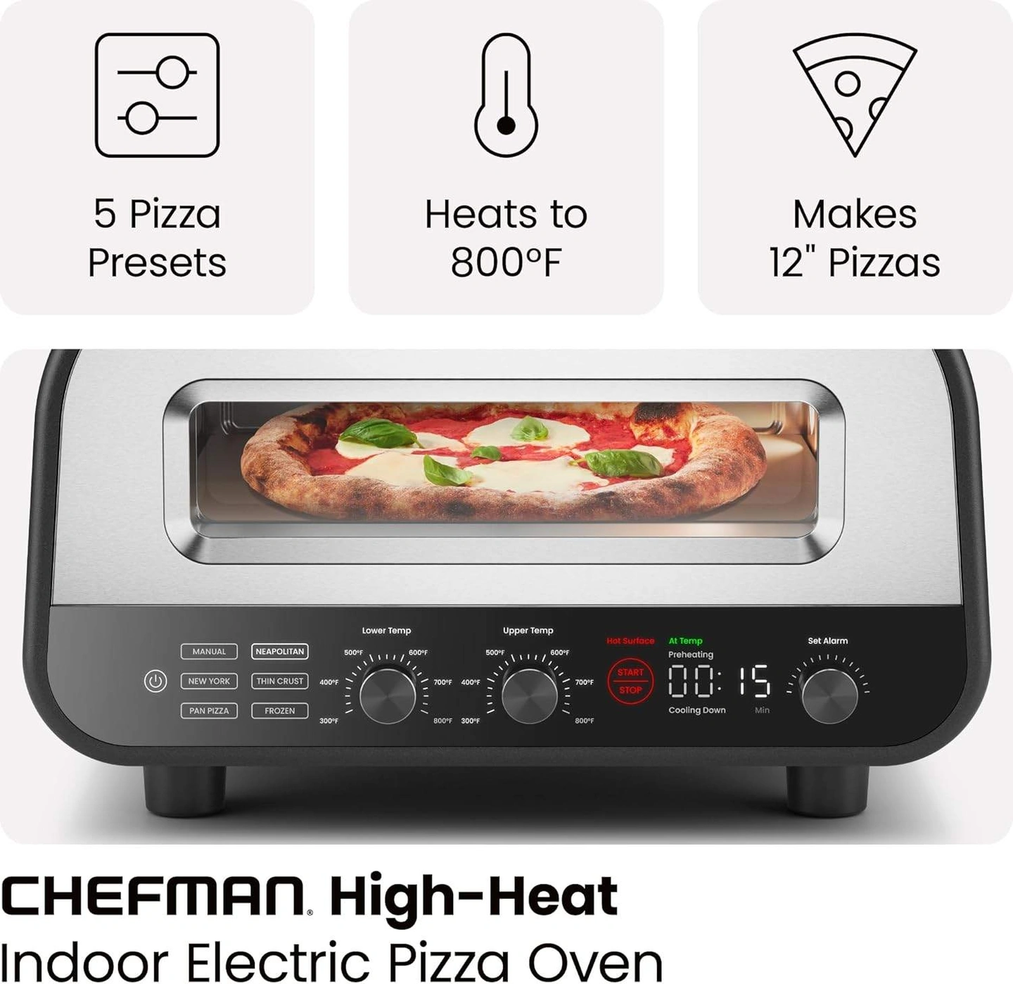 CHEFMAN Indoor Pizza Oven - Makes 12 Inch Pizzas in Minutes, Heats up to 800°F - Countertop Electric Pizza Maker with 5 Touchscreen Presets, Pizza Stone and Peel Included - Stainless Steel