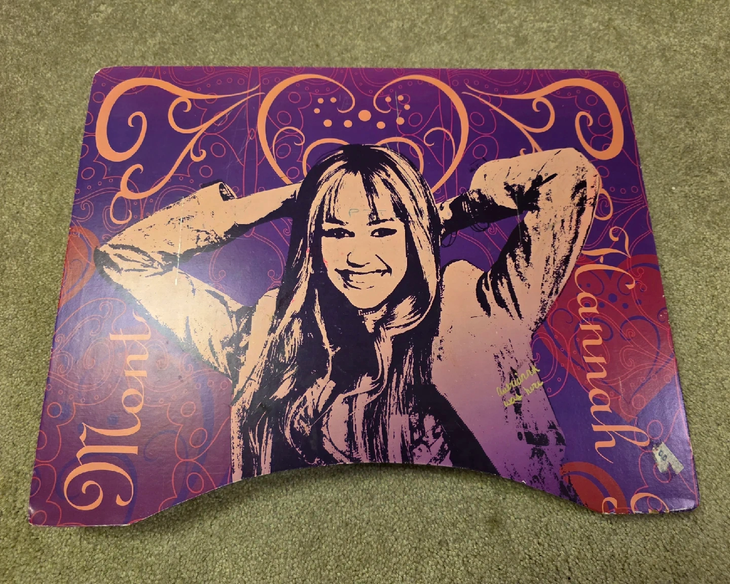 Selling a Hannah Montana lap desk! It's in good condition and has a comfortable cushion on the bottom with a zippered pouch for pens and markers. Perfect for doing homework or reading in bed!