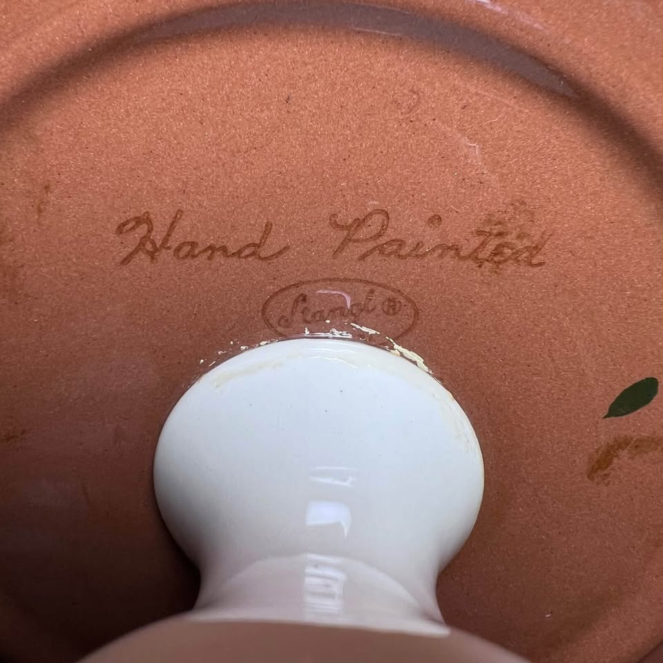 The design is hand-painted and features a variety of fruits and flowers. The pottery pieces were known for their hand-painted folk art designs based on Pennsylvania Dutch motifs, with the pattern being scratched into the piece before being hand-painted.