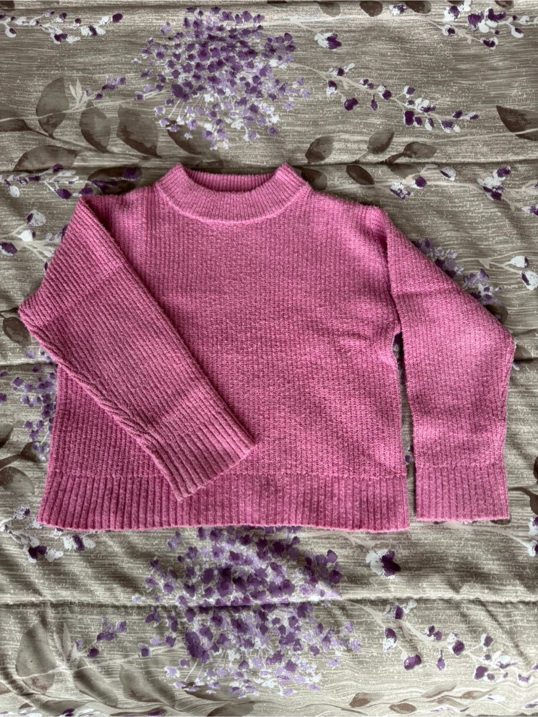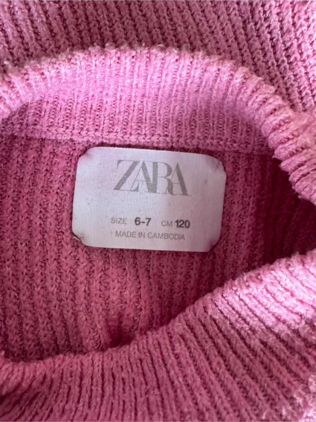 Selling a Zara knit sweater in lovely pink colour, perfect for keeping your little one warm! The size is 6-7, which is about 120cm. It's made of 55% polyester, 42% acrylic, and 3% elastane