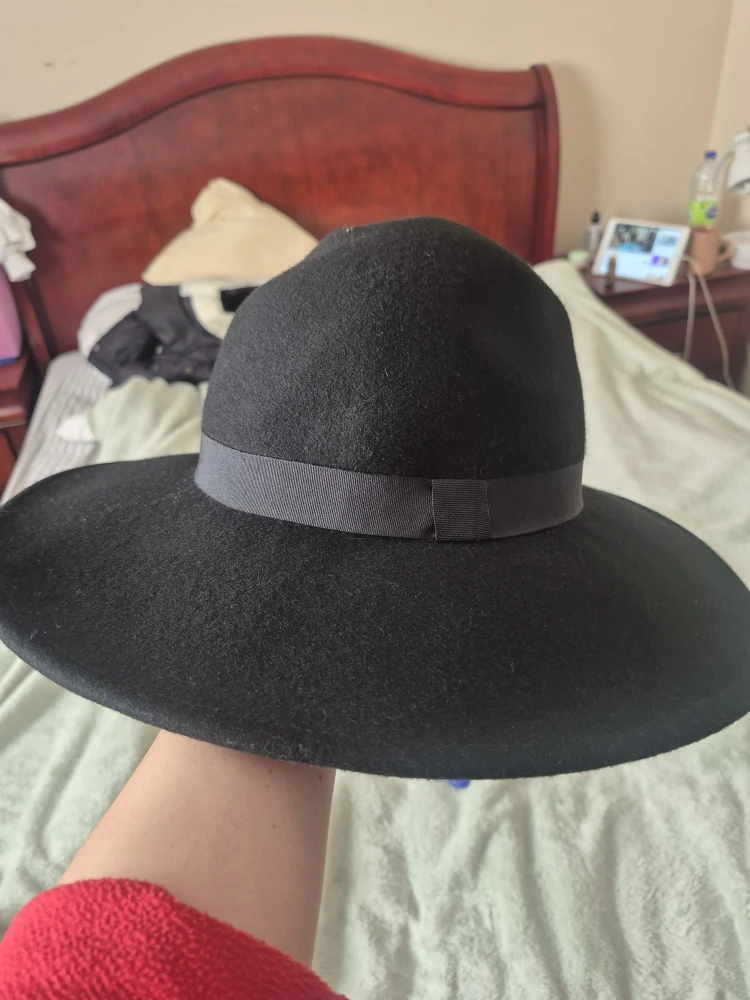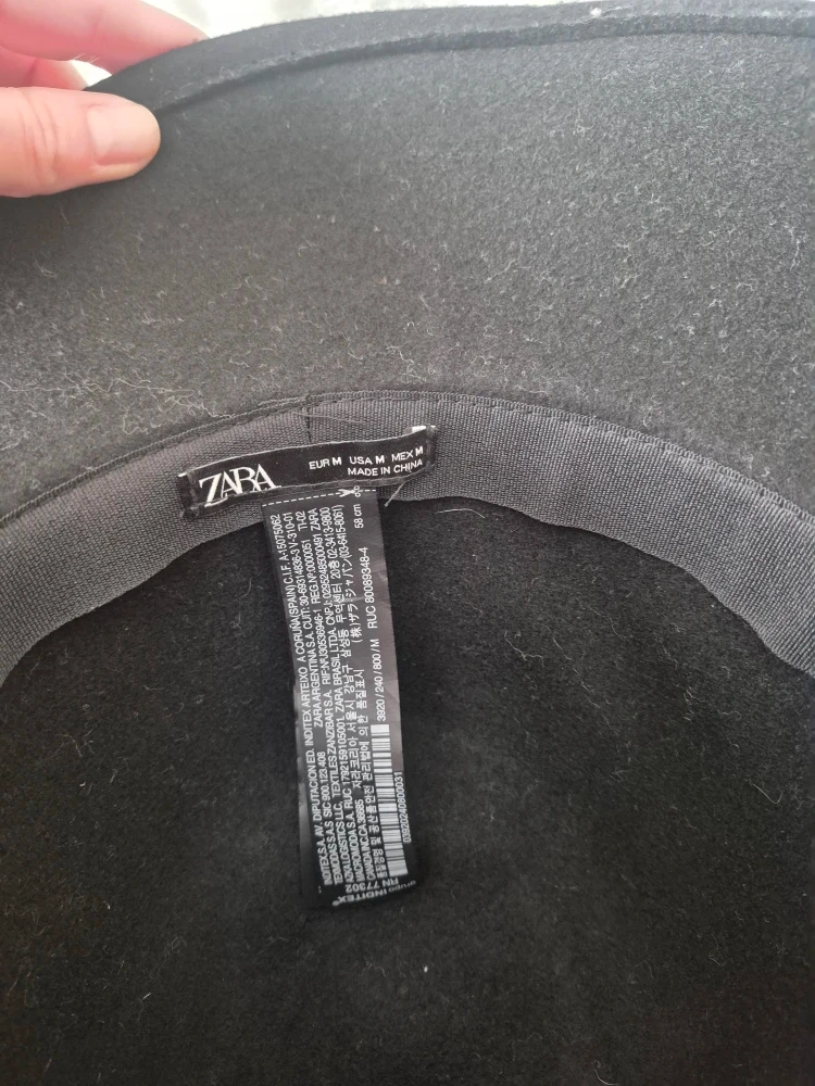Selling a stylish Zara black wool floppy hat in size M. It's in great condition and perfect for adding a touch of elegance to any outfit! The hat is made of wool and has a ribbon detail.
