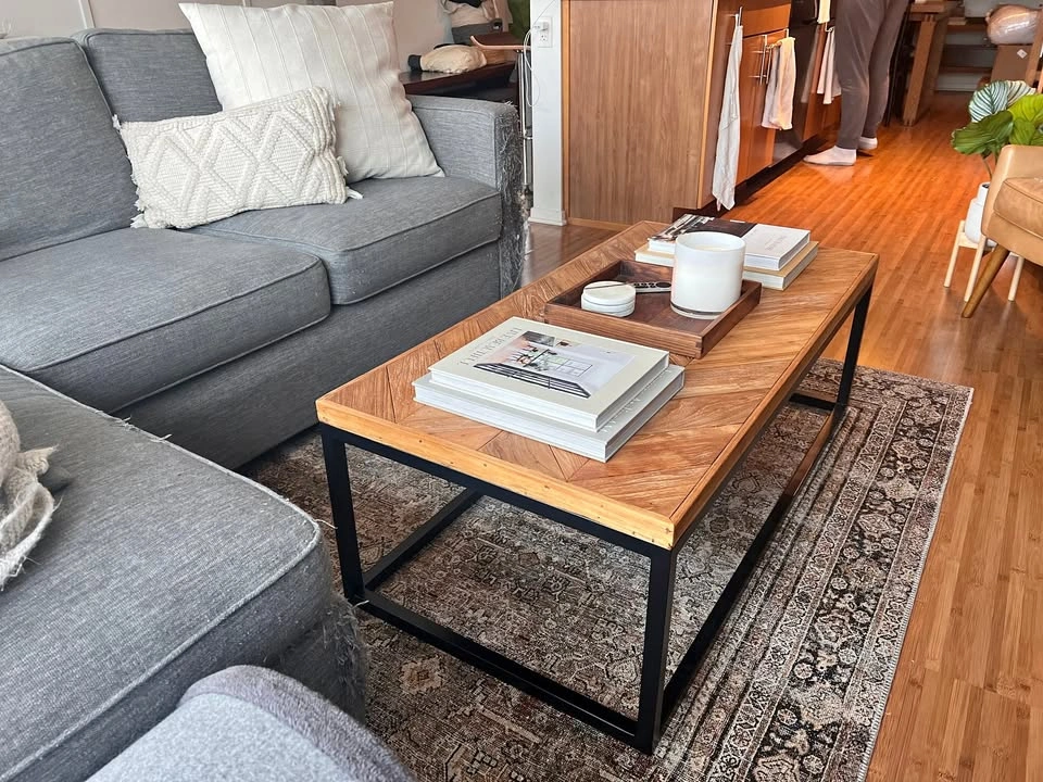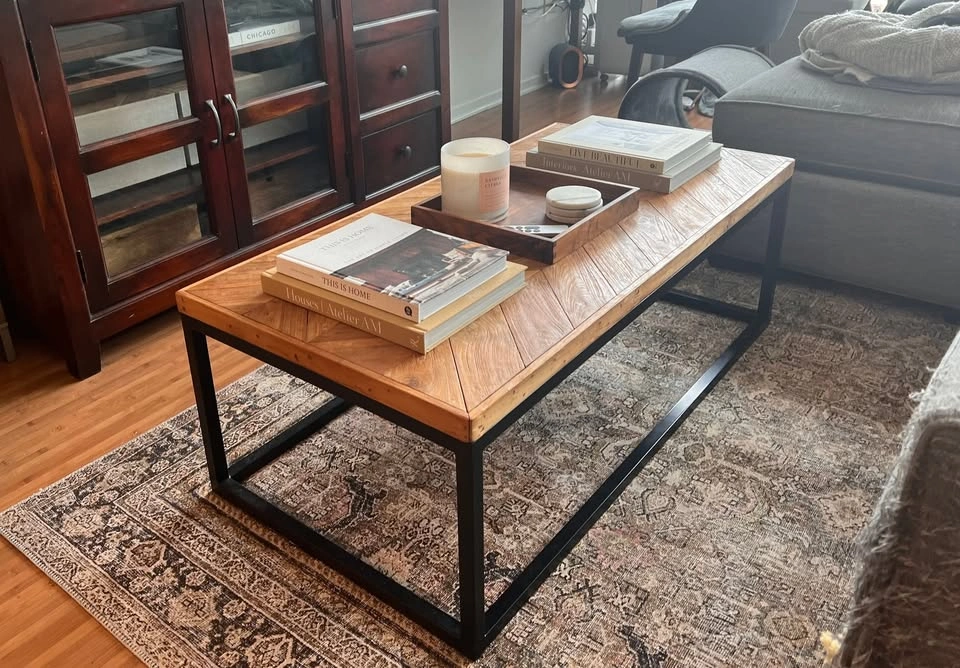 This is a discontinued table from Crate & Barrel. If you want to get a better idea of how it looks, it's EXTREMELY similar to this one (just 1 in difference in measurement and slightly different wood pattern): https://www.singulart.com/en/artworks/gie-el-zig-zag-1732676 (Retails for $1,620)