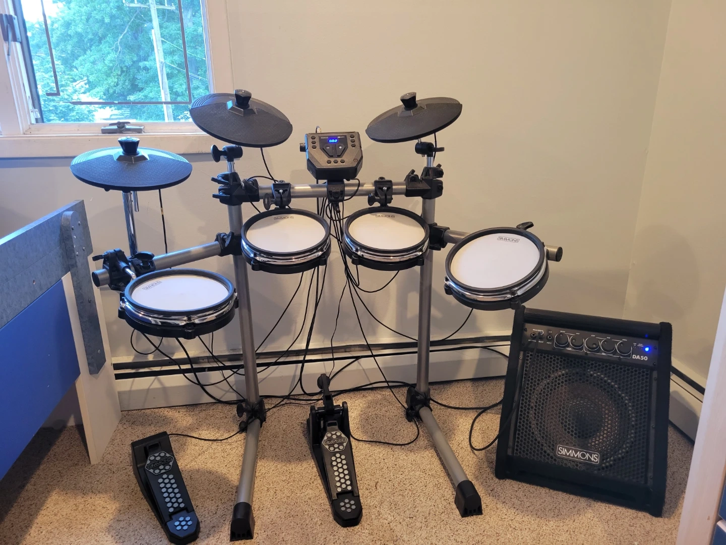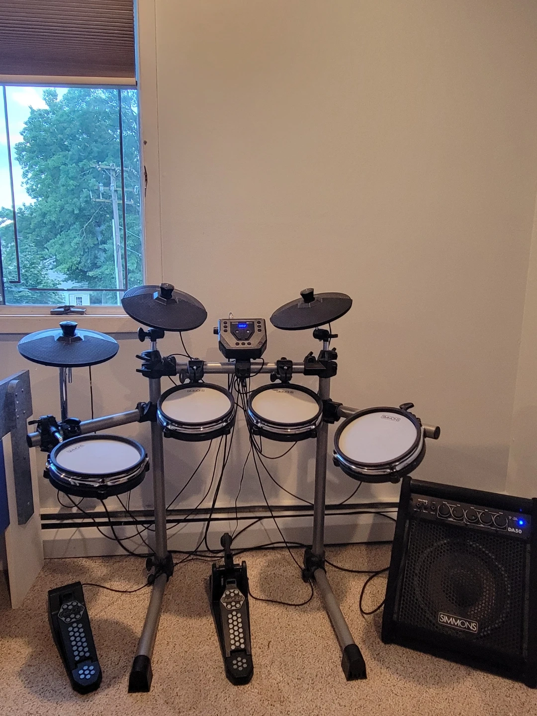 Selling a Simmons electronic drum kit. It includes the drum module, pads, kick pedal, hi-hat pedal, and a Simmons DA50 amplifier. All components are visible in the photos.