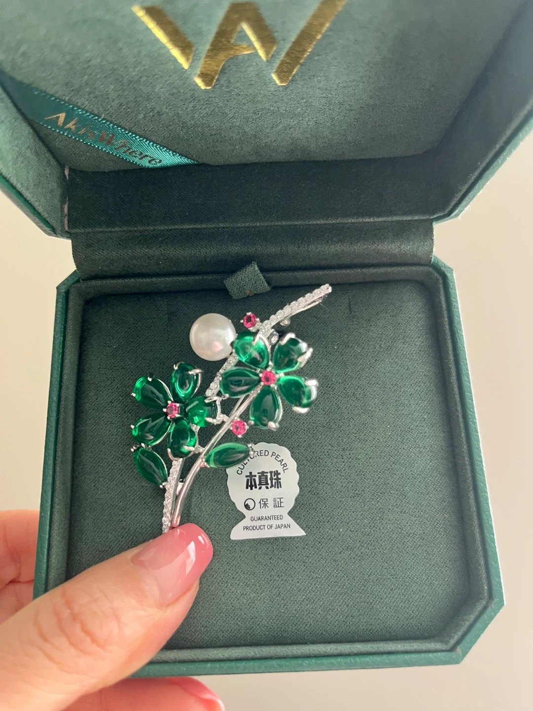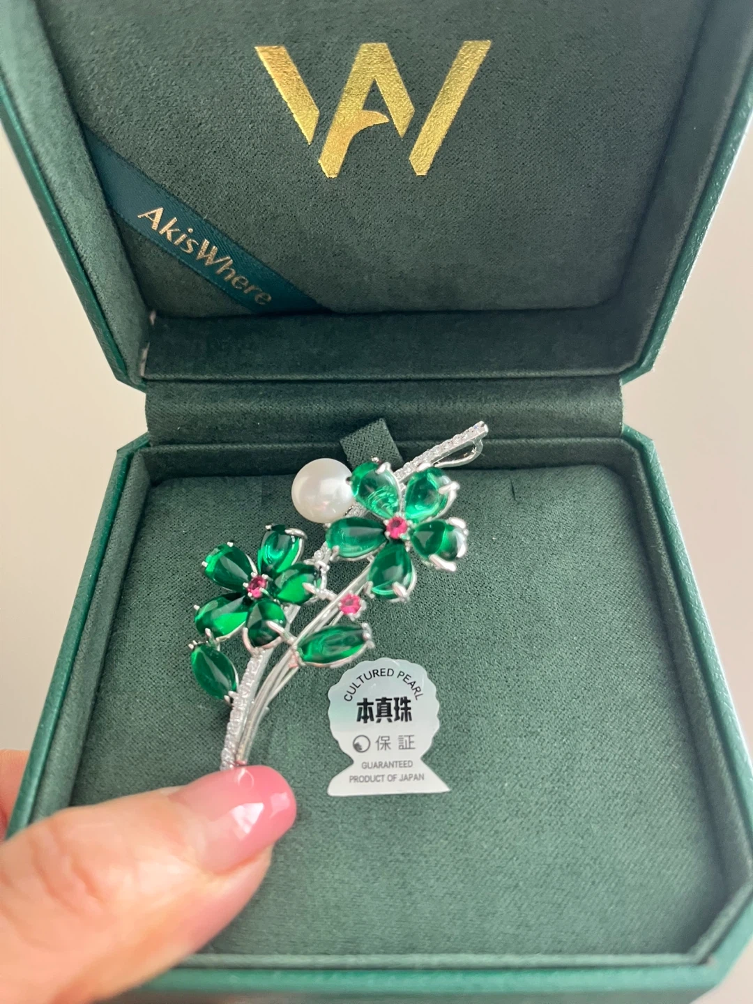 Beautiful brooch featuring a cultured pearl, emerald-coloured stones shaped like flowers, and small red accents. It's a guaranteed product of Japan, presented in its original box. This piece would be lovely for adding a touch of elegance to an outfit!