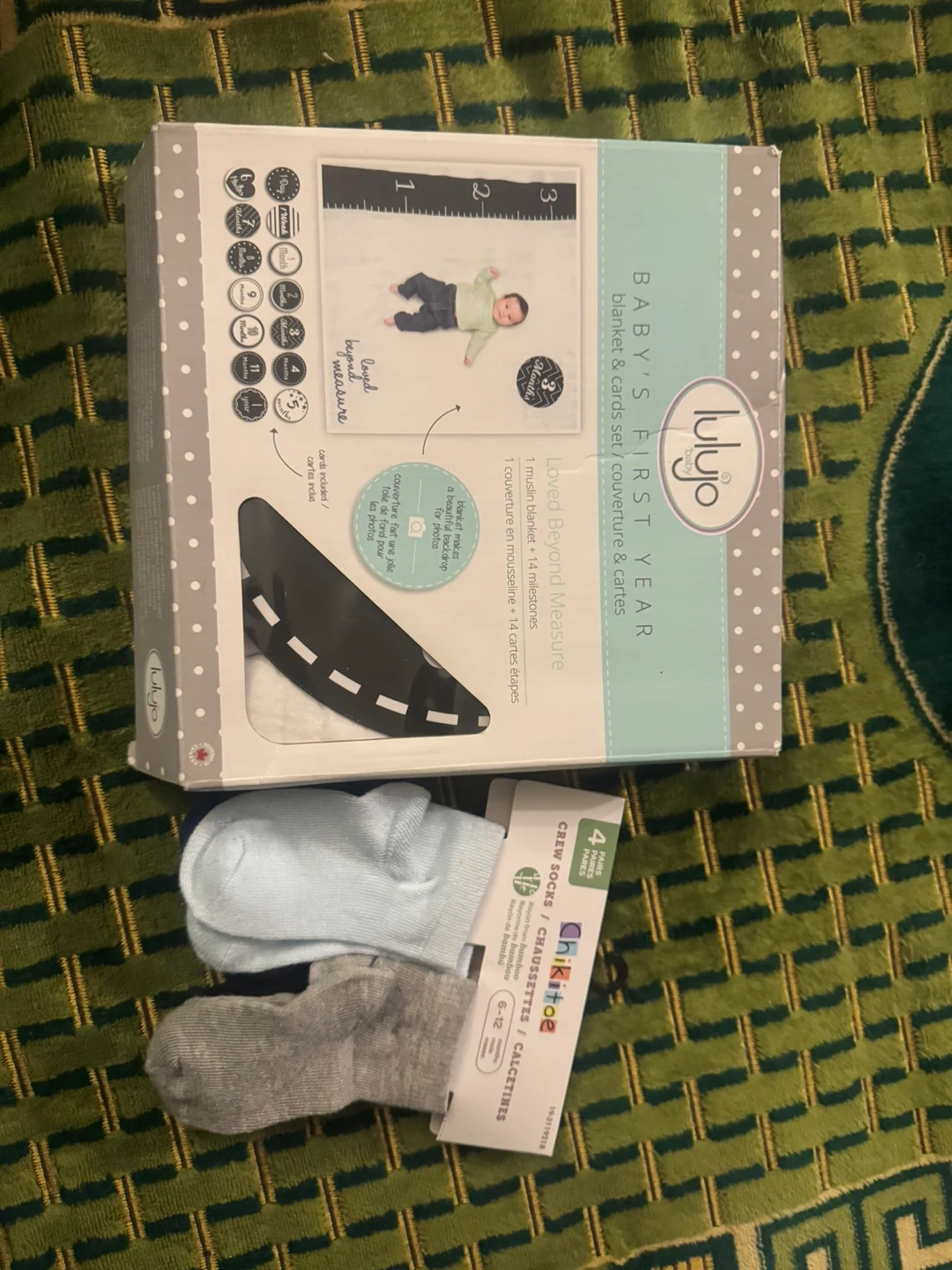 I have a Lulyo Baby's First Year blanket and cards set, perfect for tracking your little one's milestones Also included are a pair of Chikitita crew socks, size 6-12 months. Comes with the original box