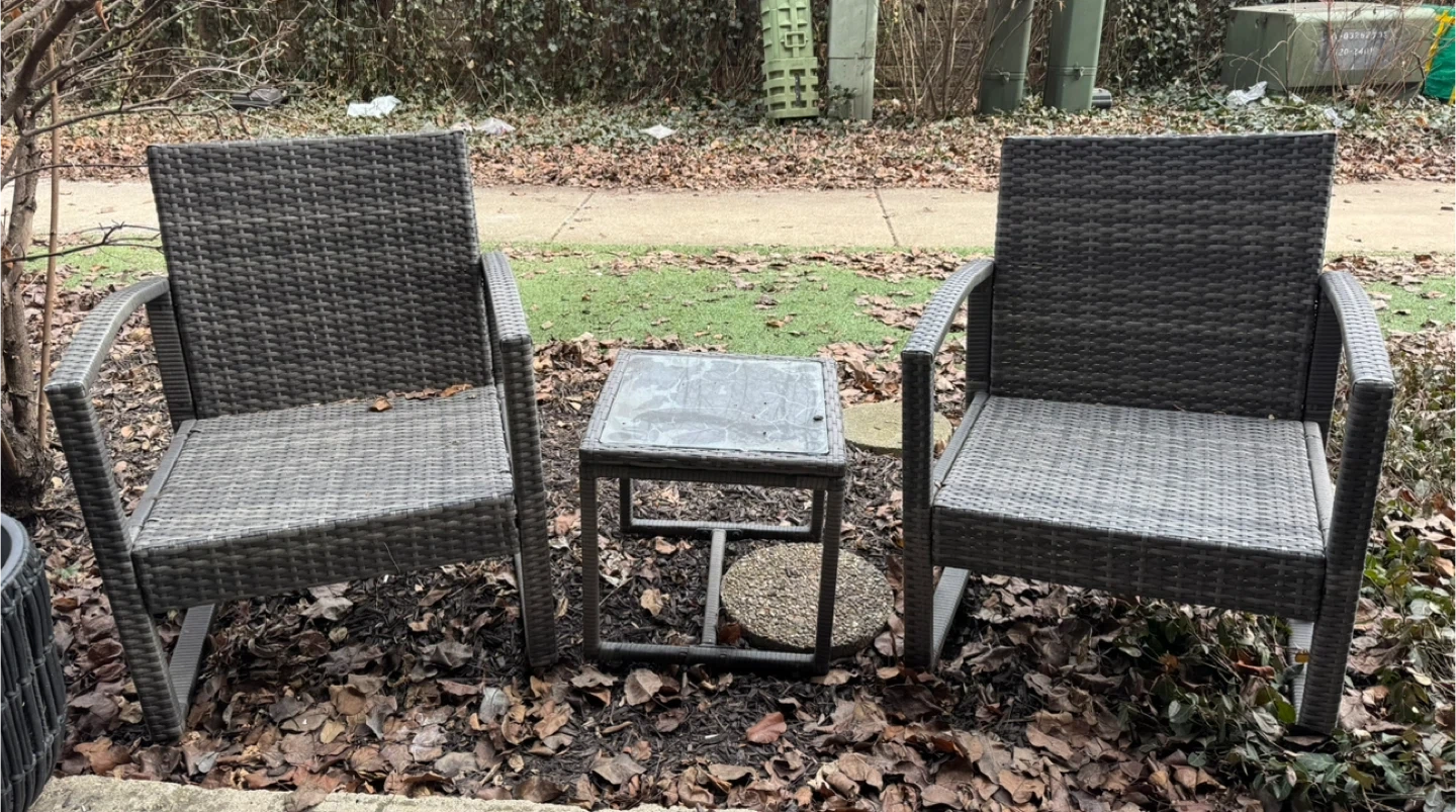 This set includes two wicker chairs and a small square side table with a glass top. The furniture is gray and designed for outdoor use. It's great for a small patio or balcony! Perfect for enjoying your morning coffee or evening drink outside.