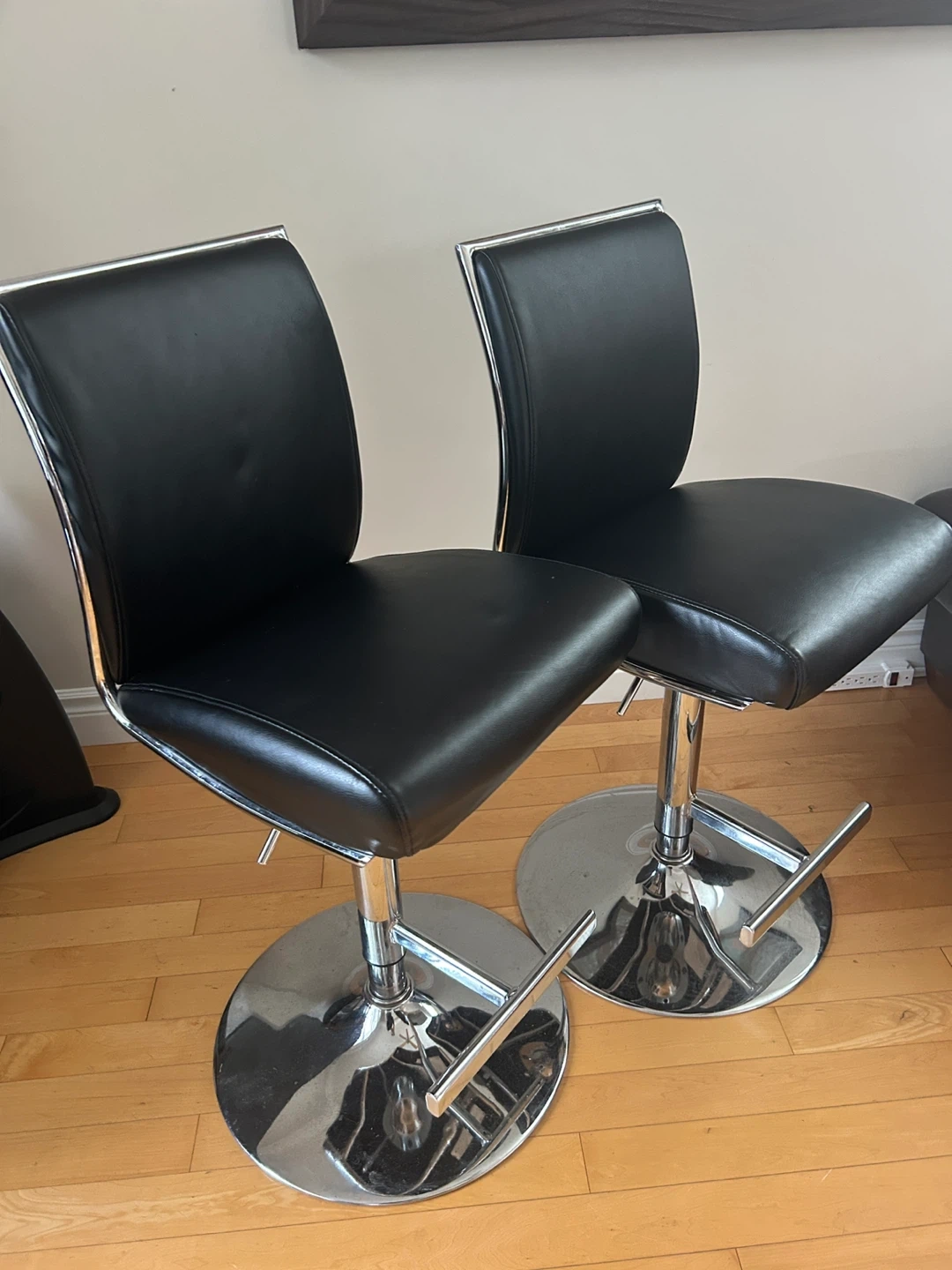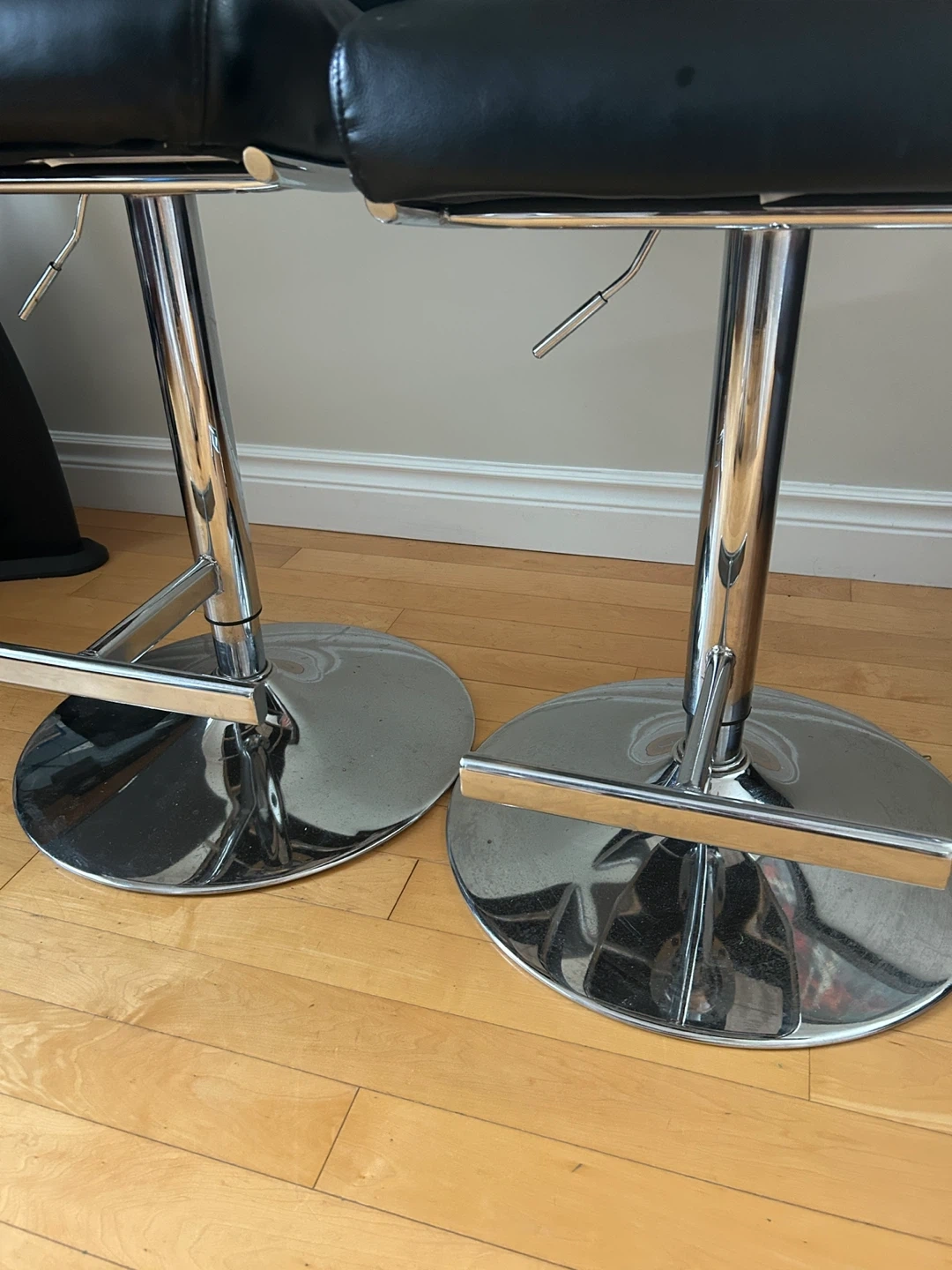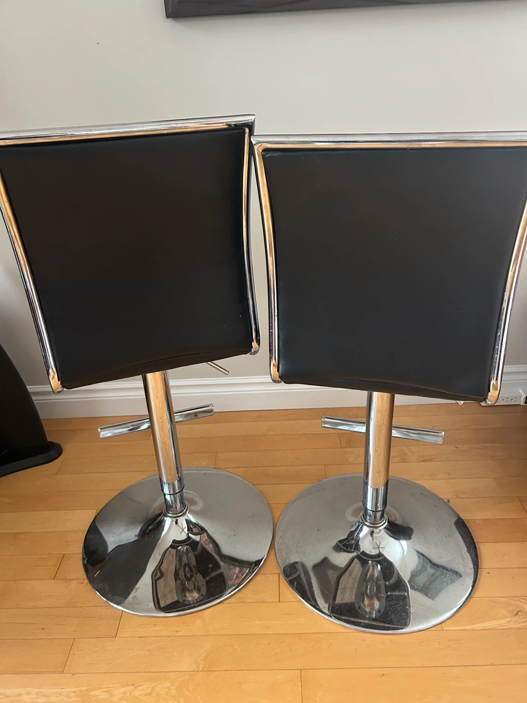 Selling a set of two bar stools in great condition. They feature a sleek black seat and a chrome base. Perfect for a kitchen island or bar area!