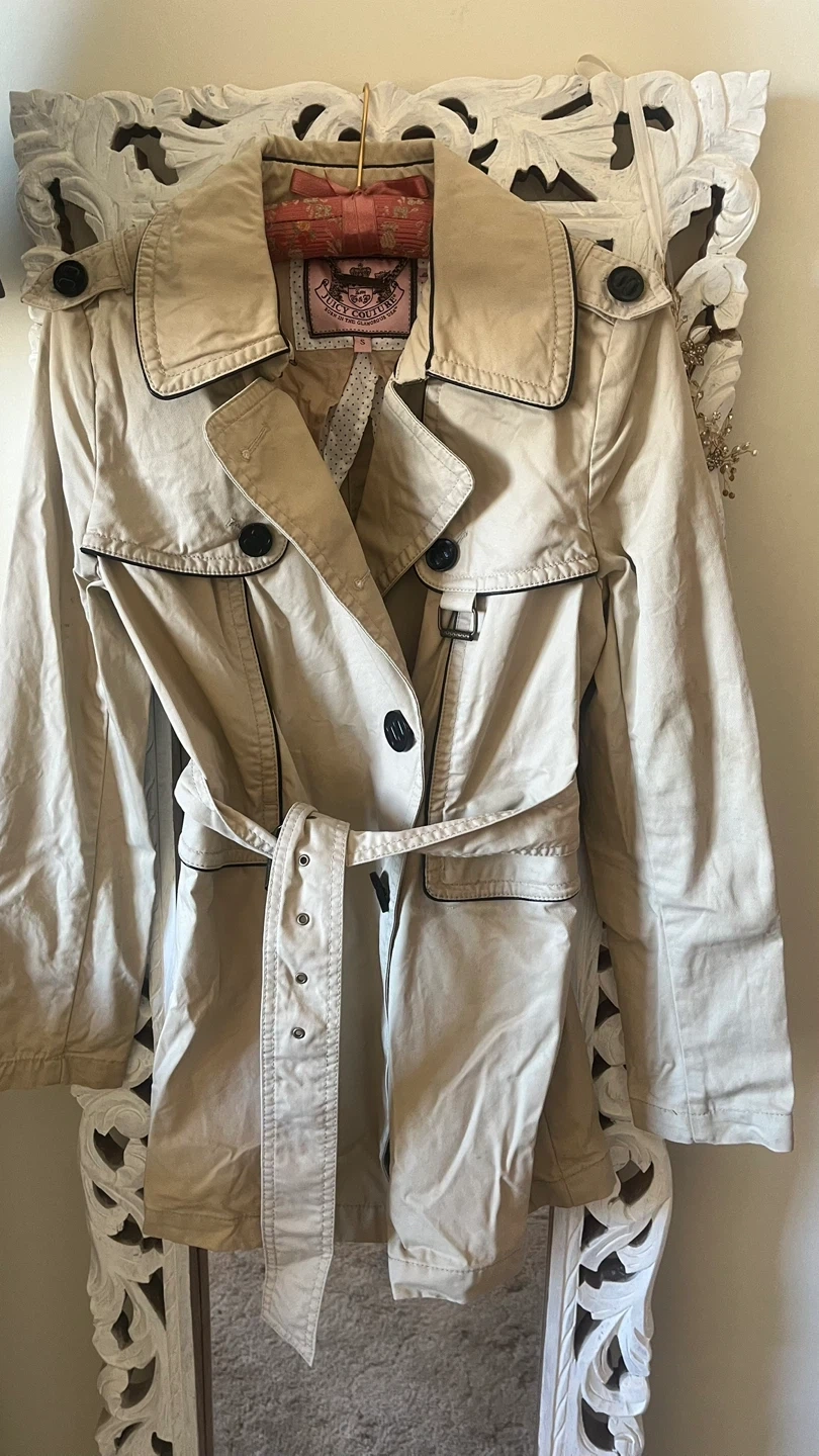 Selling a Juicy Couture trench coat in size small. It's in great condition and features a stylish design with a belt. Perfect for adding a touch of glam to your wardrobe!