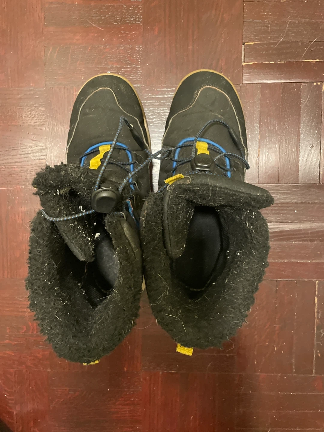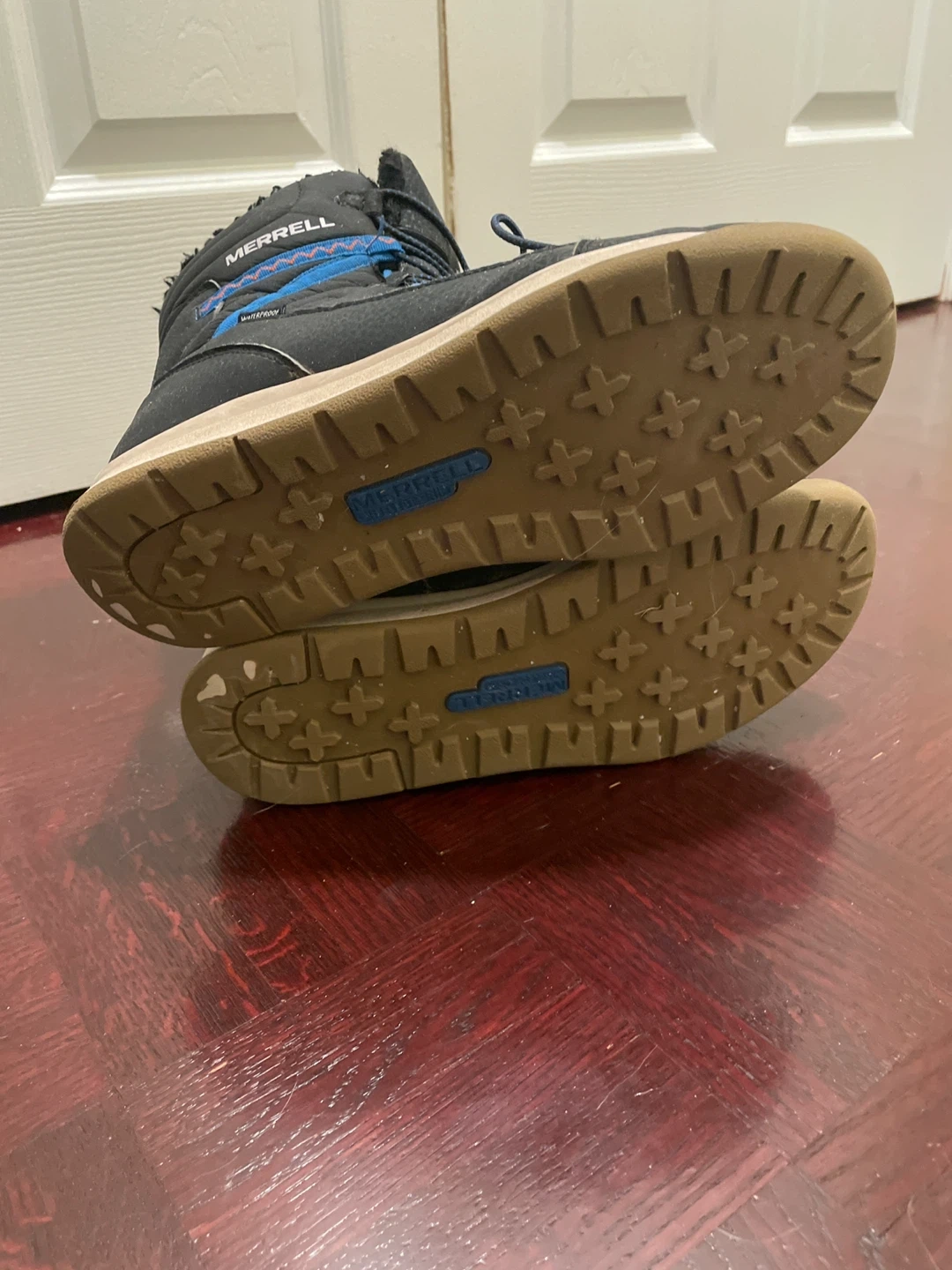 Selling a pair of Merrell waterproof winter boots. They're black with blue and yellow accents. The boots are insulated to keep your feet warm in cold weather. There is a temperature rating of -25°F / -32°C on the back of the boot. Size 6M boys