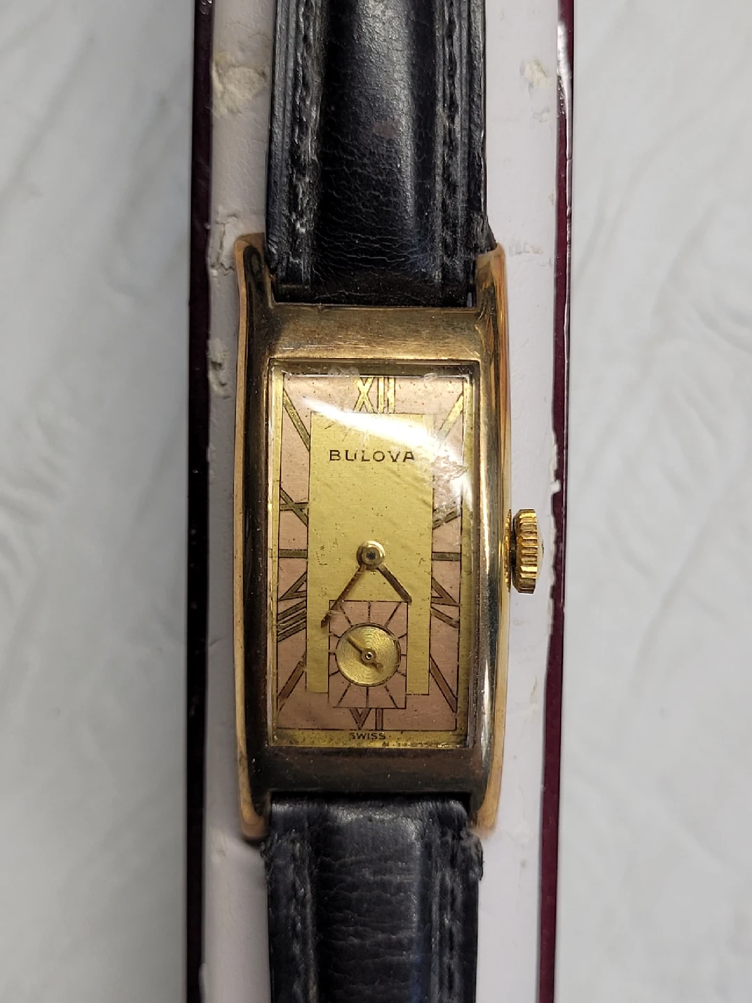 Selling a vintage Bulova watch with a gold-tone case and black leather strap. It's a beautiful timepiece with a classic design. The watch face has Roman numerals and a unique geometric pattern. "SWISS" is printed on the watch face. "OBO"