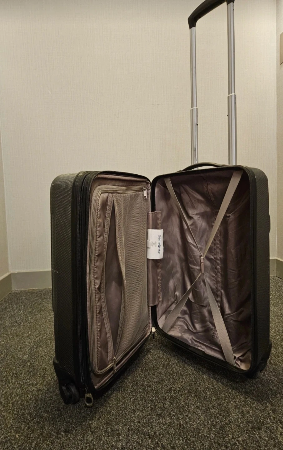 Selling a Samsonite hard shell carry-on suitcase in black. It's in great condition and ready for your next trip! Features include a retractable handle and interior straps to keep your belongings secure with 4 360-degree wheels.