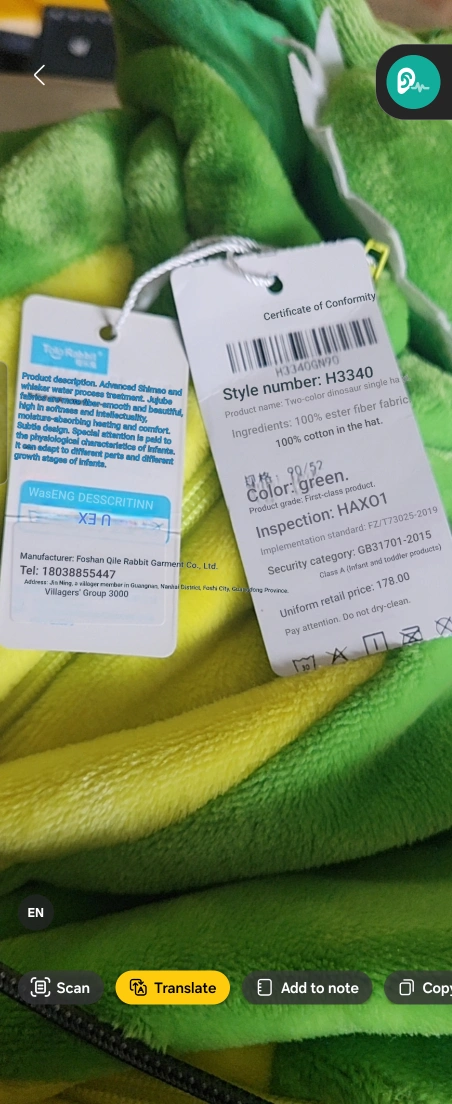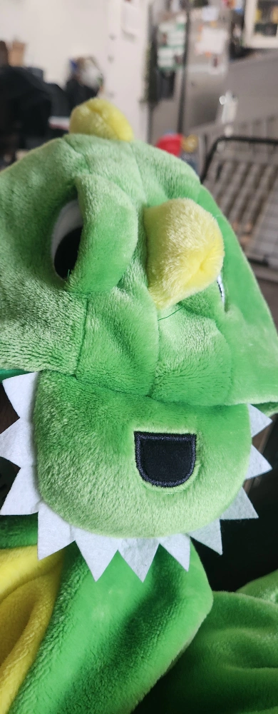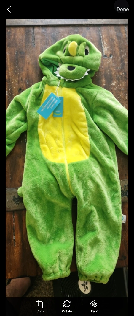 Selling a cute two-color dinosaur costume! It's in size 90/52 which is for 2 year oldsand features a fun green color. The style number is H3340. Made with 100% ester fiber fabric, it's a comfortable choice for your little one. This costume