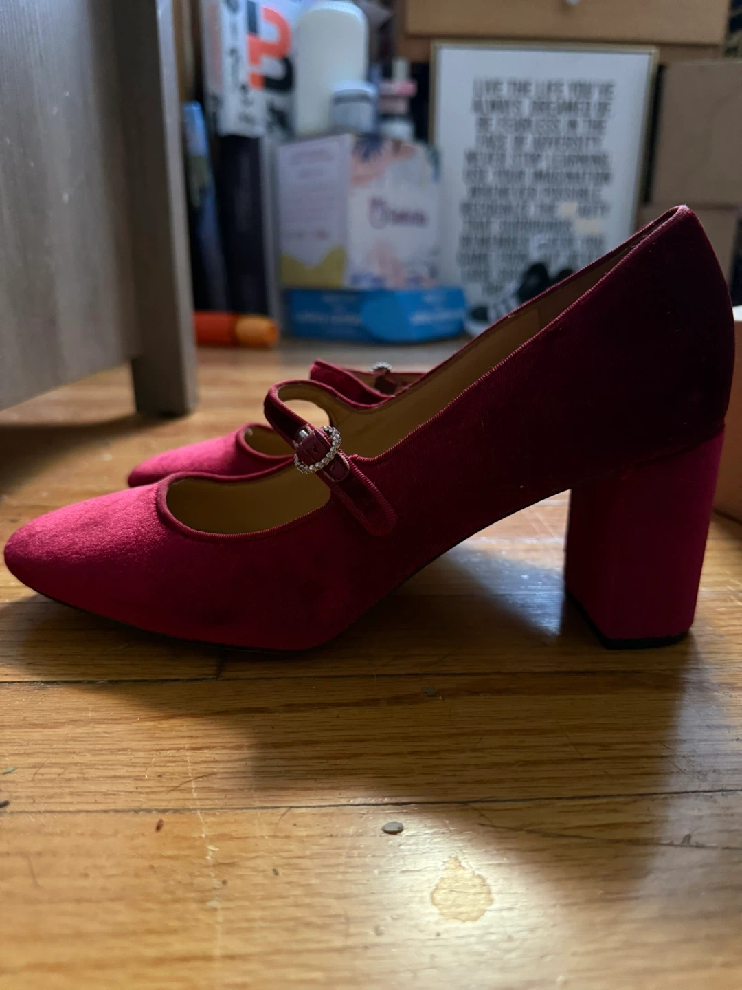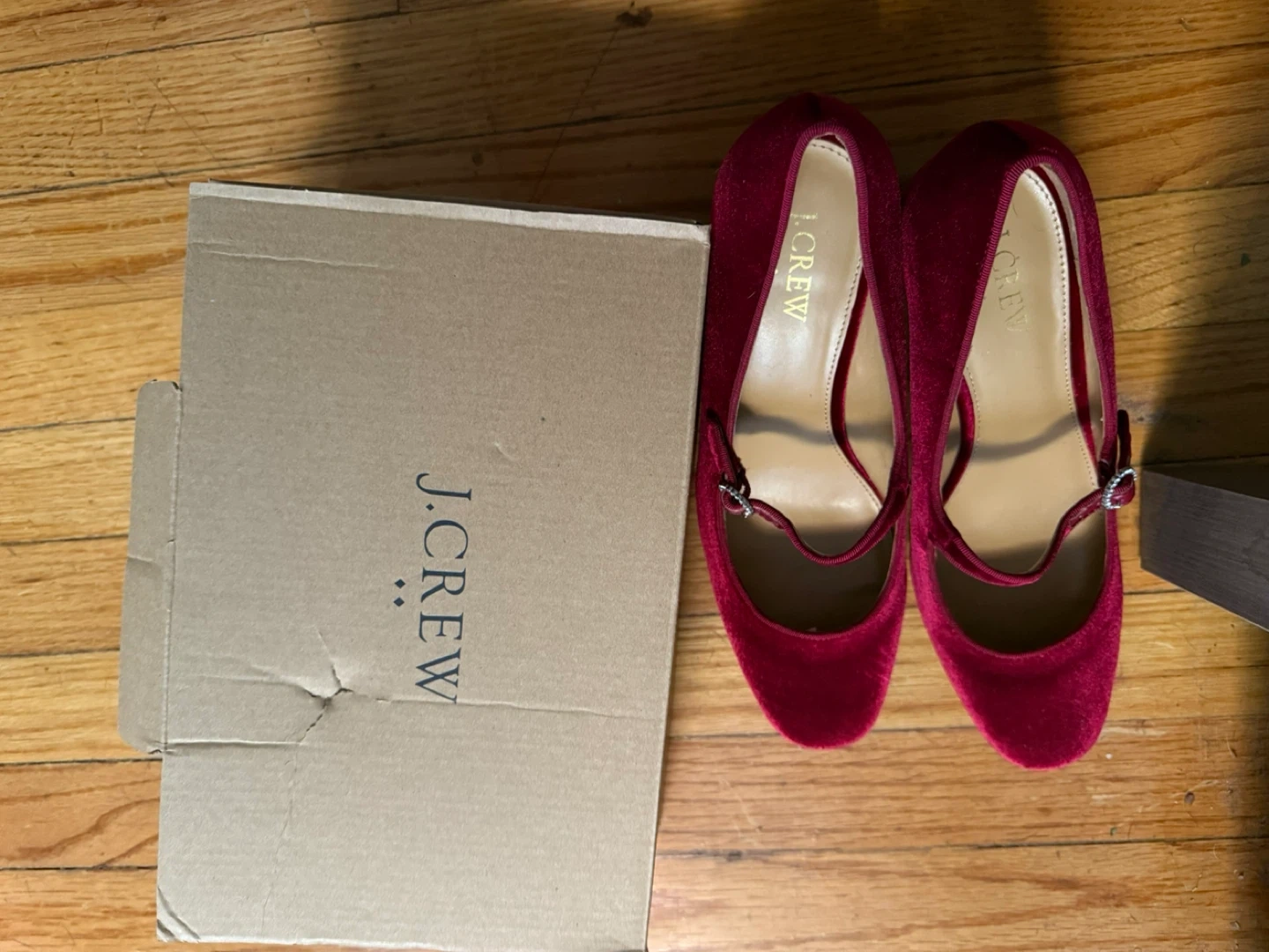 Selling a pair of J.Crew velvet Mary Jane heels. They are velvet material in a beautiful deep red color and in new condition (never worn). Great for a holiday party!!!