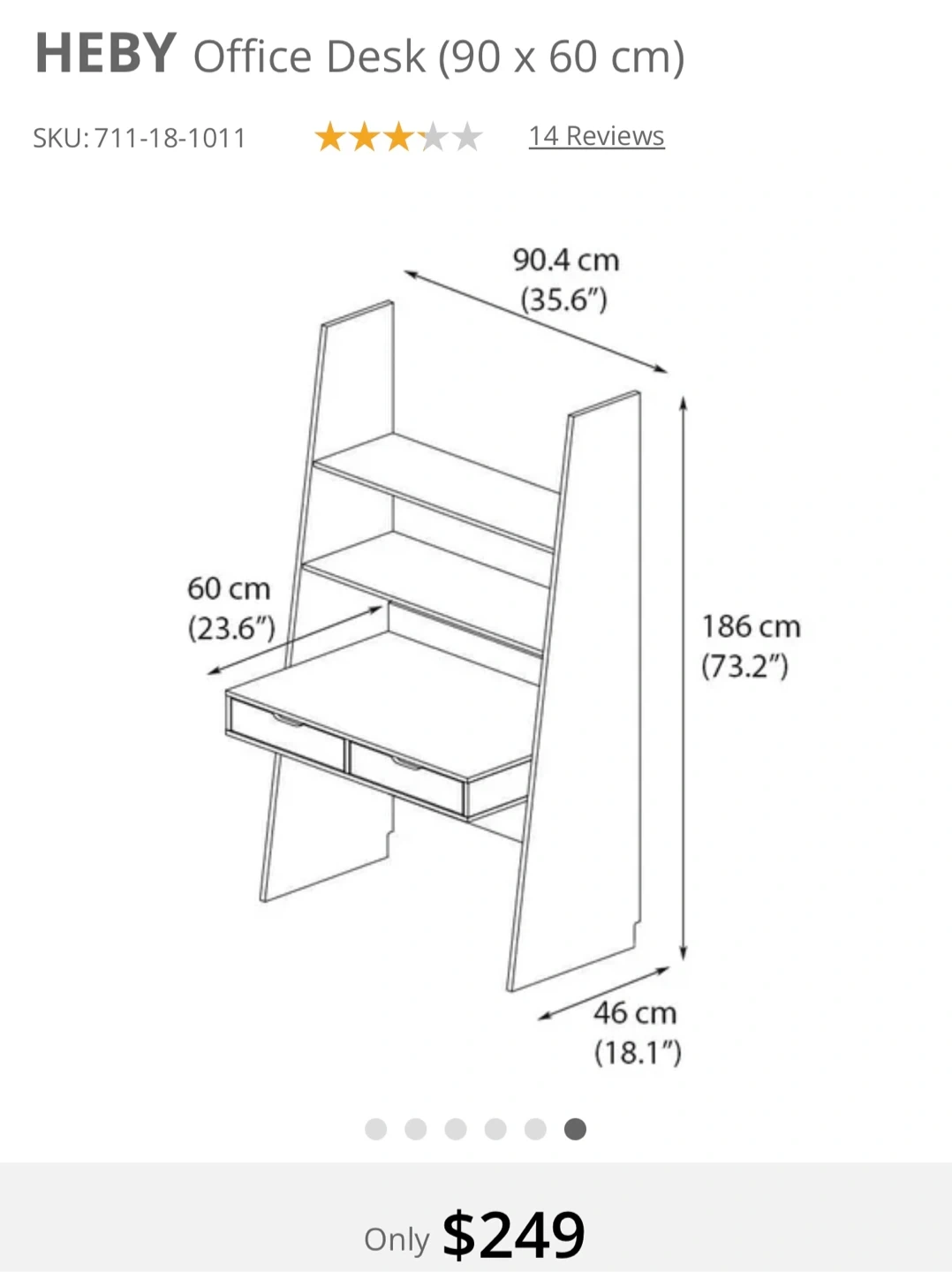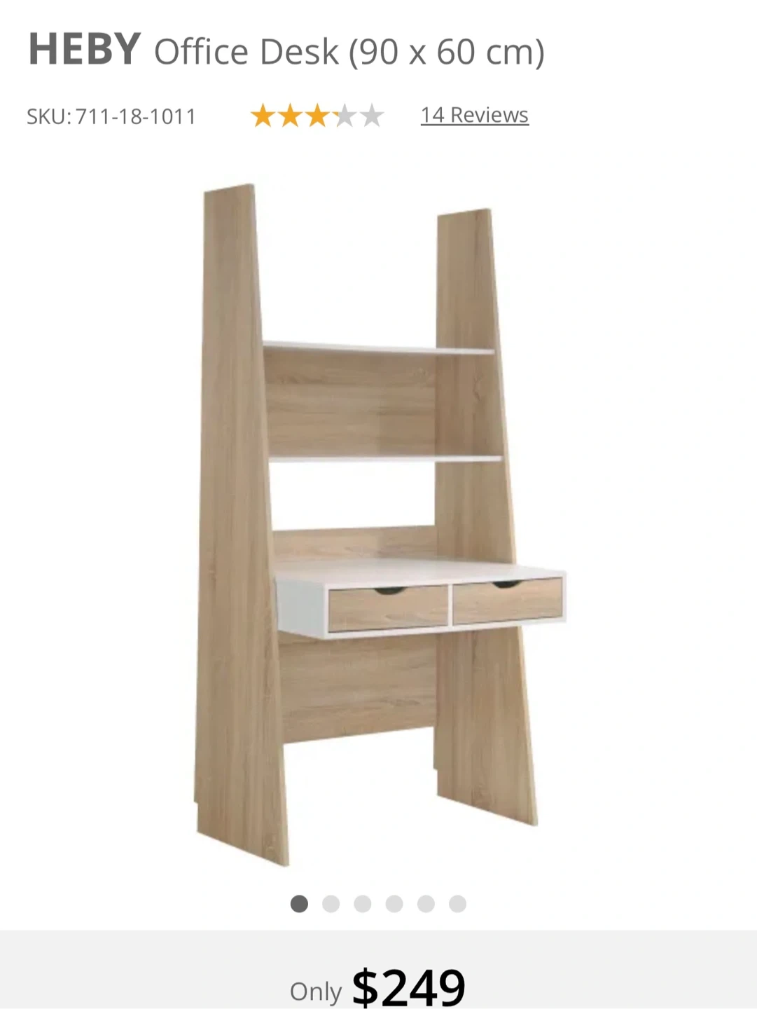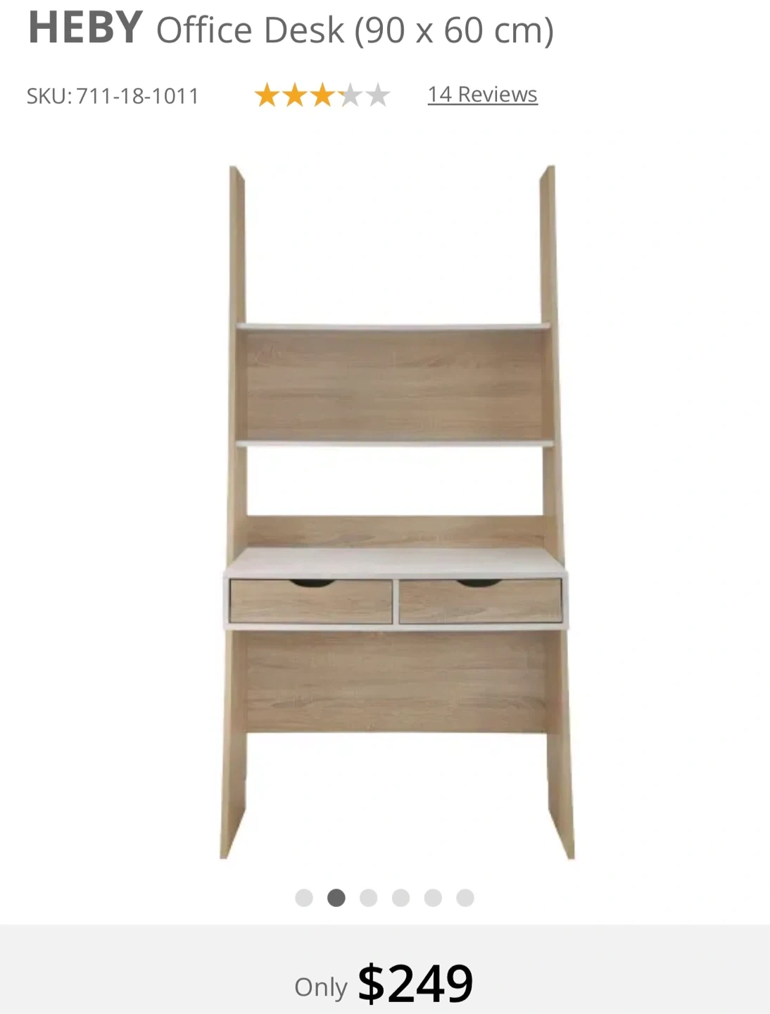Selling a HEBY office desk, measuring 90 x 60 cm. The desk features a clean design with shelving and drawers for storage. Originally bought for $249. Missing one shelve and sign of usage