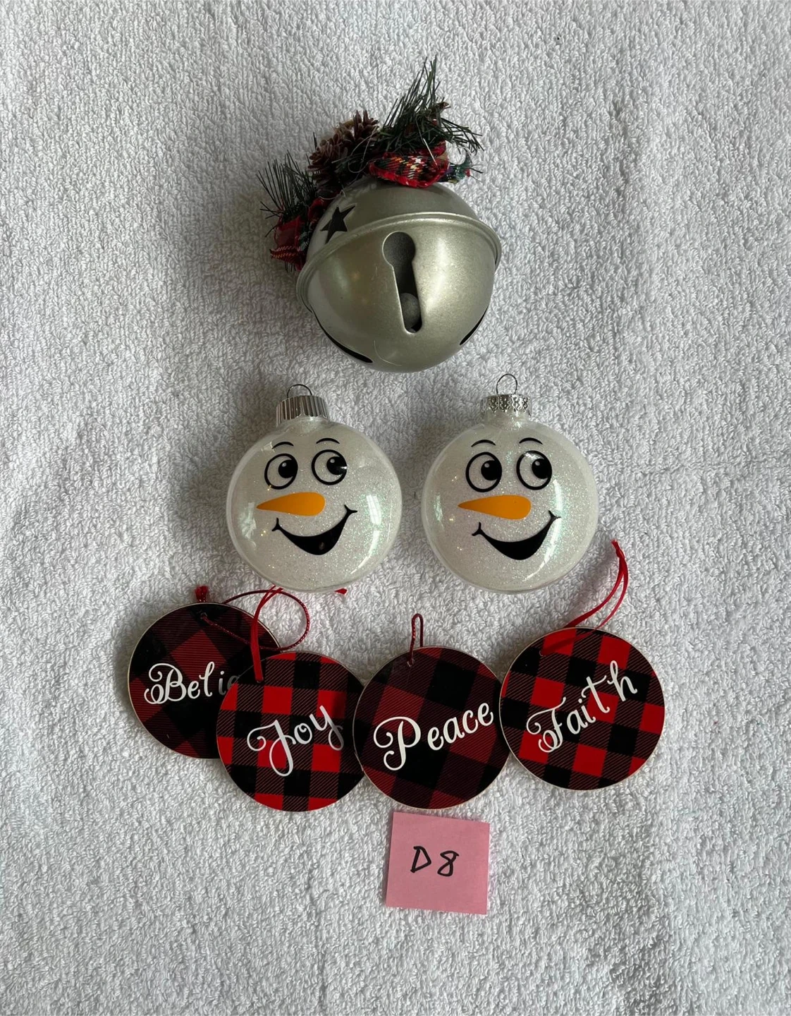 Spruce up your Christmas tree with these cute ornaments! There's a silver bell with festive greenery, two adorable snowman ornaments, and four plaid ornaments with the words Believe, Joy, Peace, and Faith all of which are handmade and new. (Not sold separately)