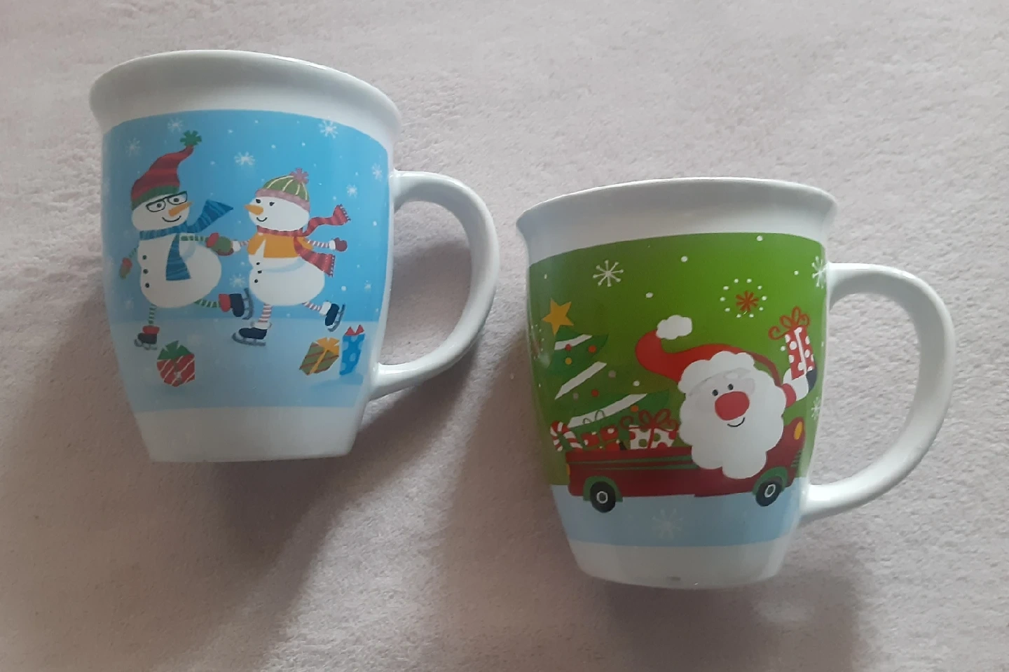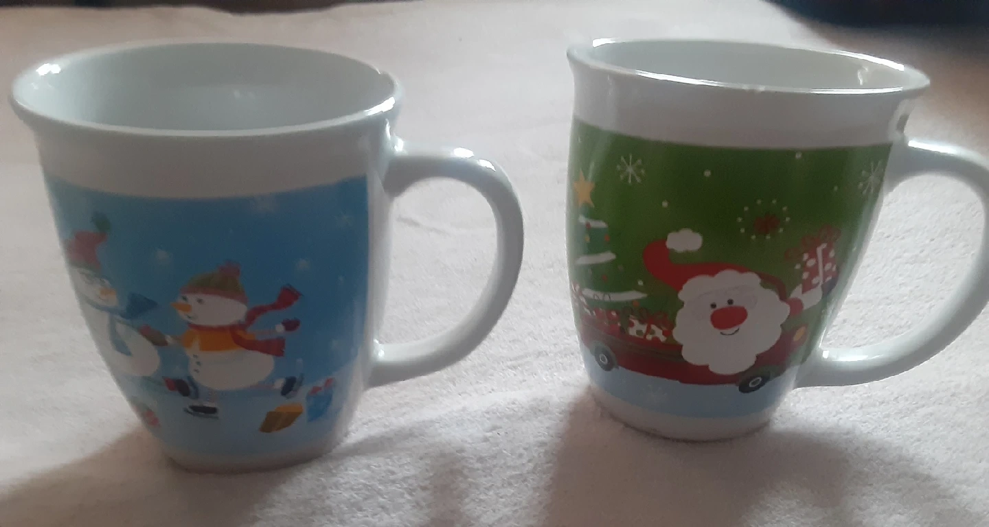 Two festive Christmas mugs, perfect for the holiday season! One features a cheerful Santa in his car, and the other has adorable snowmen skating. Add a touch of holiday spirit to your morning coffee or hot chocolate with these cute mugs