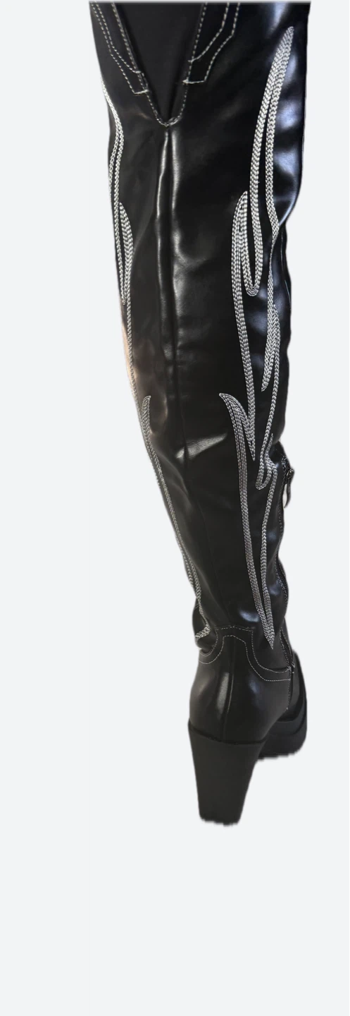 Selling a pair of black cowboy thigh high boots. They have a unique design with silver stitching. Perfect for adding a bit of flair to your outfit!