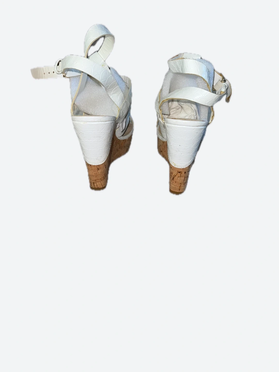 These white wedge heels are a stylish addition to any wardrobe! They feature a unique cork wedge and a textured white upper. Perfect for dressing up or down, they're in great condition and ready for a new home. Size 8.