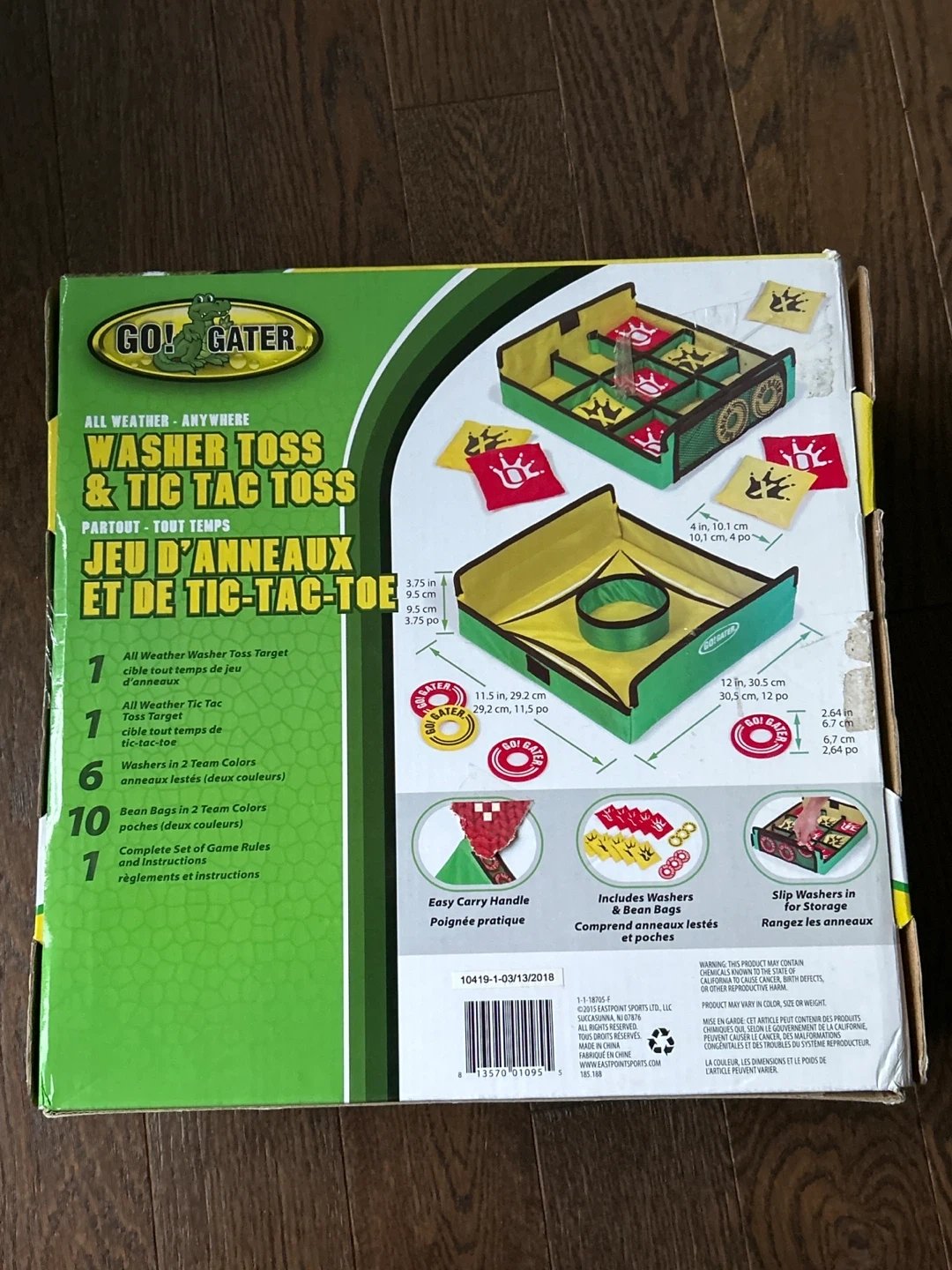 Gater Washer Toss & Tic Tac Toss game. It's an all-weather, anywhere game that includes washers and bean bags. The box includes an easy carry handle and slip washers for storage.
