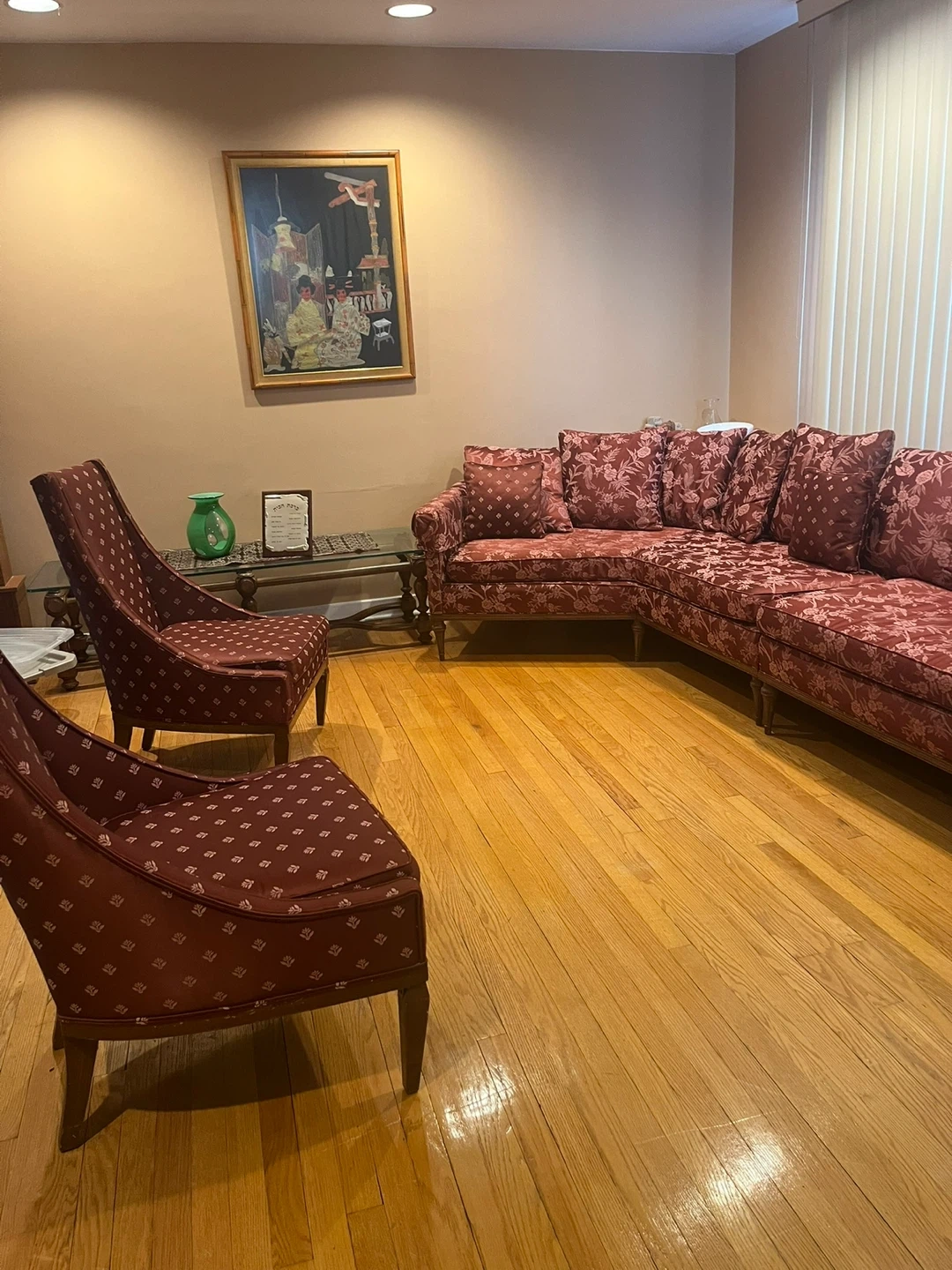 Upholstered in cranberry colored sophisticated fabric