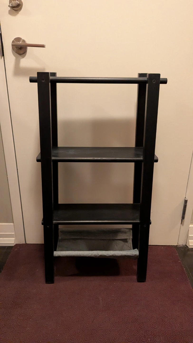 Here's a handy black wooden shelf unit, perfect for adding storage to any room. It's in great shape and ready for a new home!