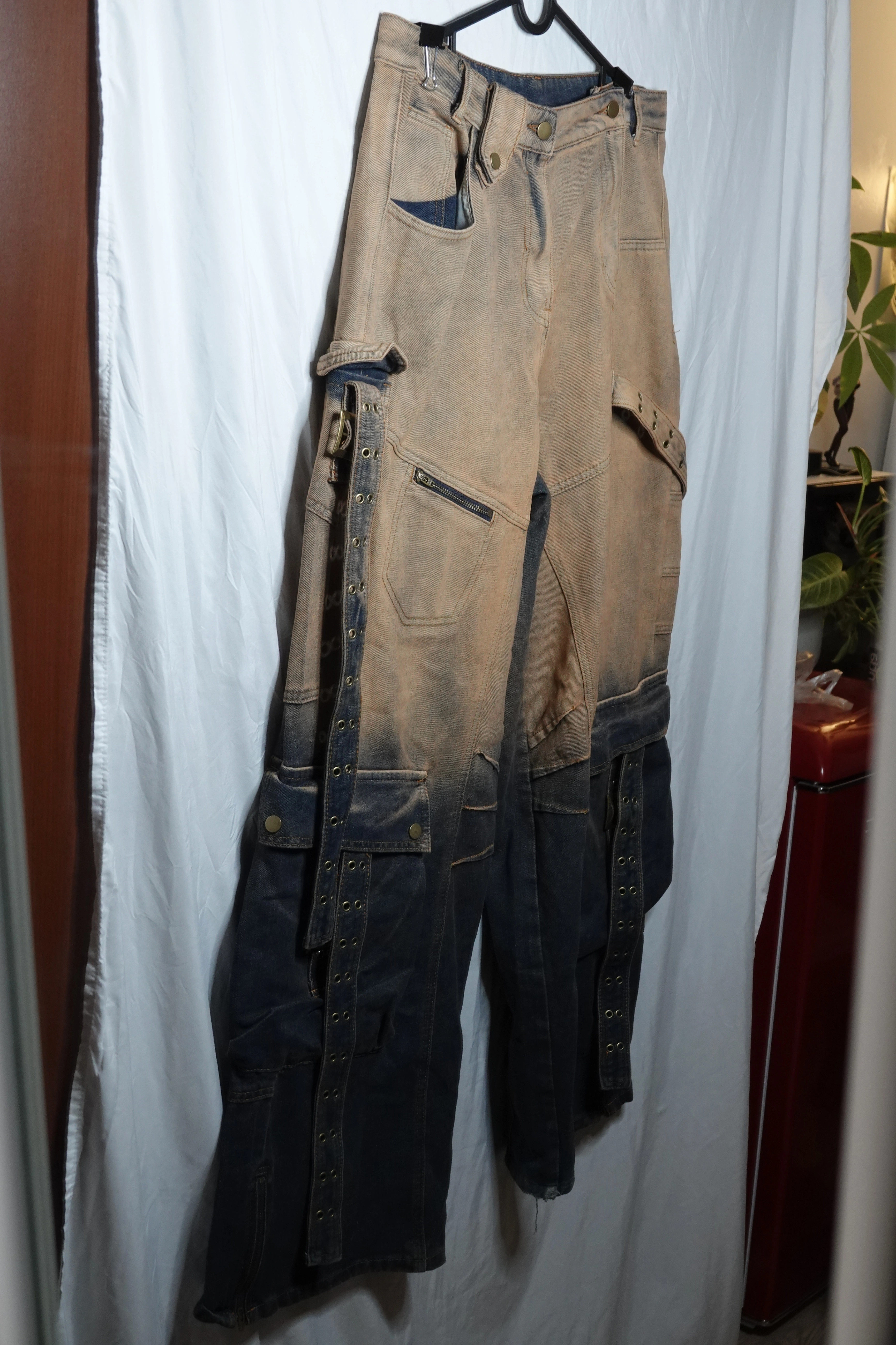 Manfinity cargo jeans in XL: faded brown-to-black ombre wash, multiple oversized utility and patch pockets, belt loops, zip and snap hardware, adjustable belt gear straps, and reinforced panel construction. Baggy, relaxed fit—ideal for streetwear, techwear, or utility styling. Condition: Gently used, original color fade and hardware intact, no holes or major stains. Pickup only 1 minute away from 115 Haynes Ave. ***I’m currently selling a variety of items that belonged to a friend who recently left Canada —everything is in good or excellent condition. Items include furniture, electronics, clothes, décor, and more. Check out my other listings if you’re looking to furnish or organize your space affordably.