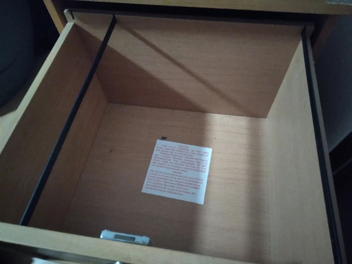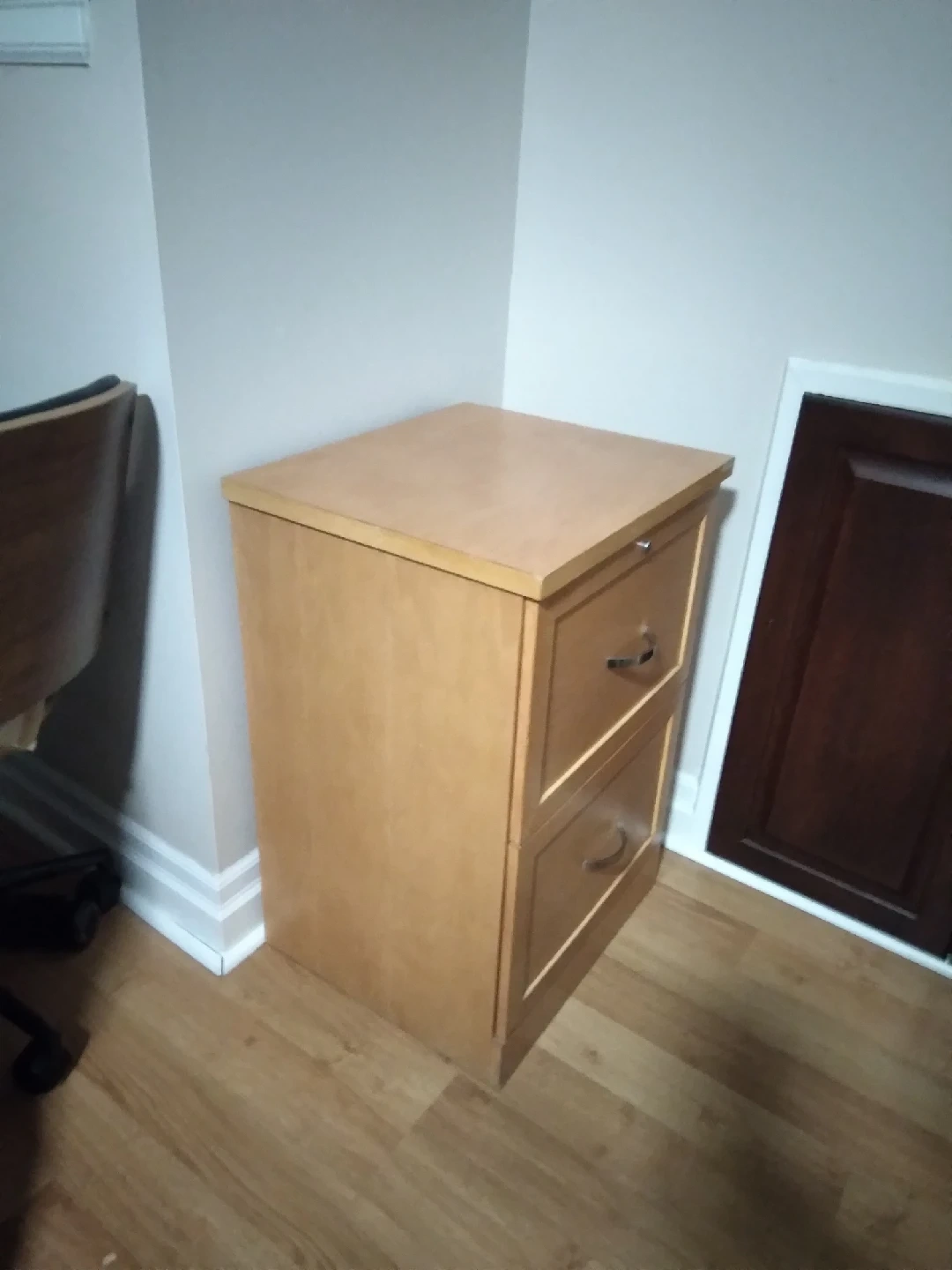 Selling a two-drawer filing cabinet. It's a light brown colour and has silver coloured handles. There is some damage to the top of the cabinet, as seen in the photos.