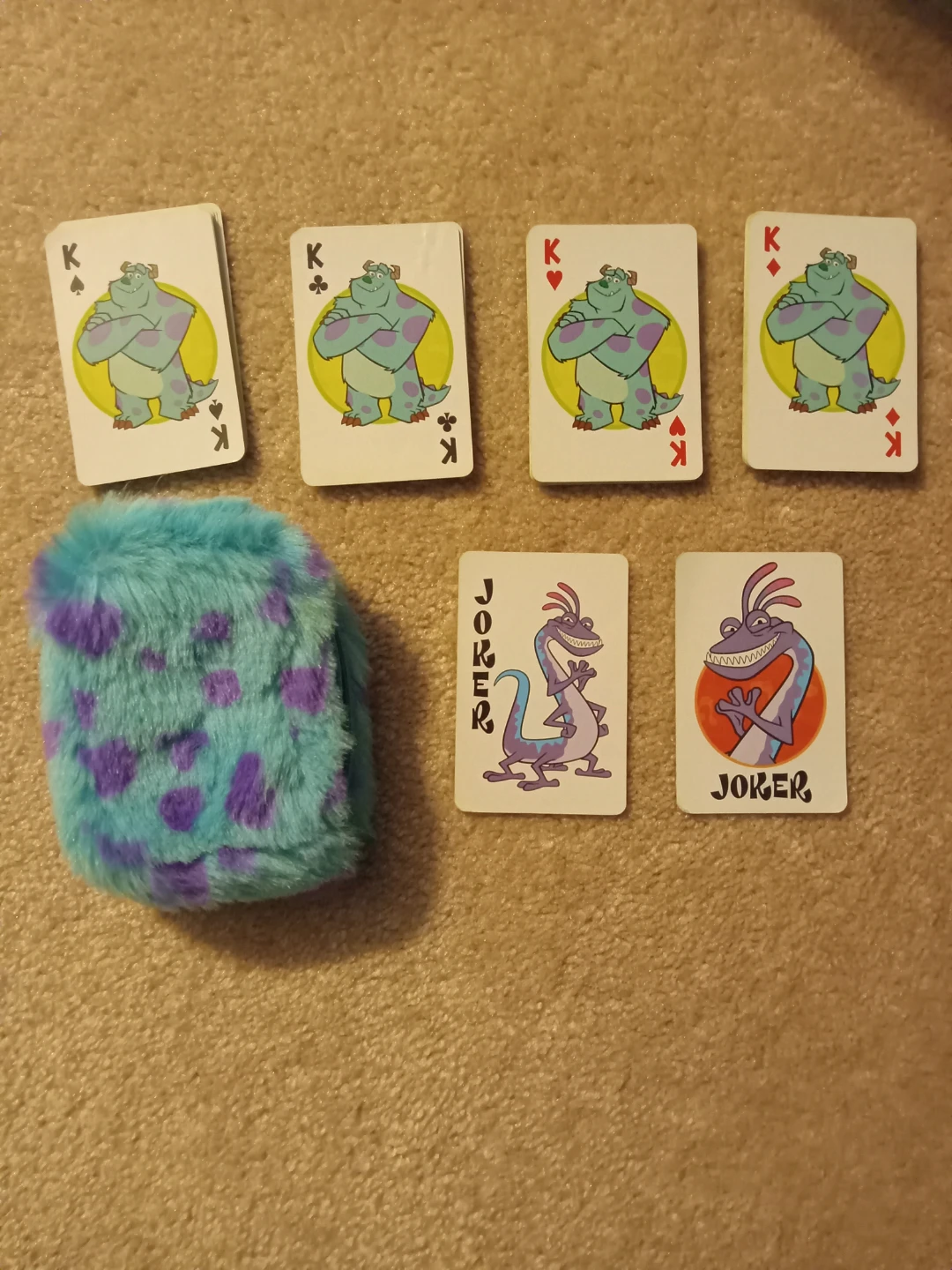 Selling a set of Monsters, Inc. Vintage playing cards and Case. The cards feature characters like Sully, Mike Wazowski, and Boo. The case is soft and made with synthetic material to look like a patch of sullys fur!