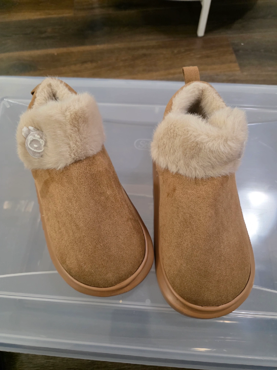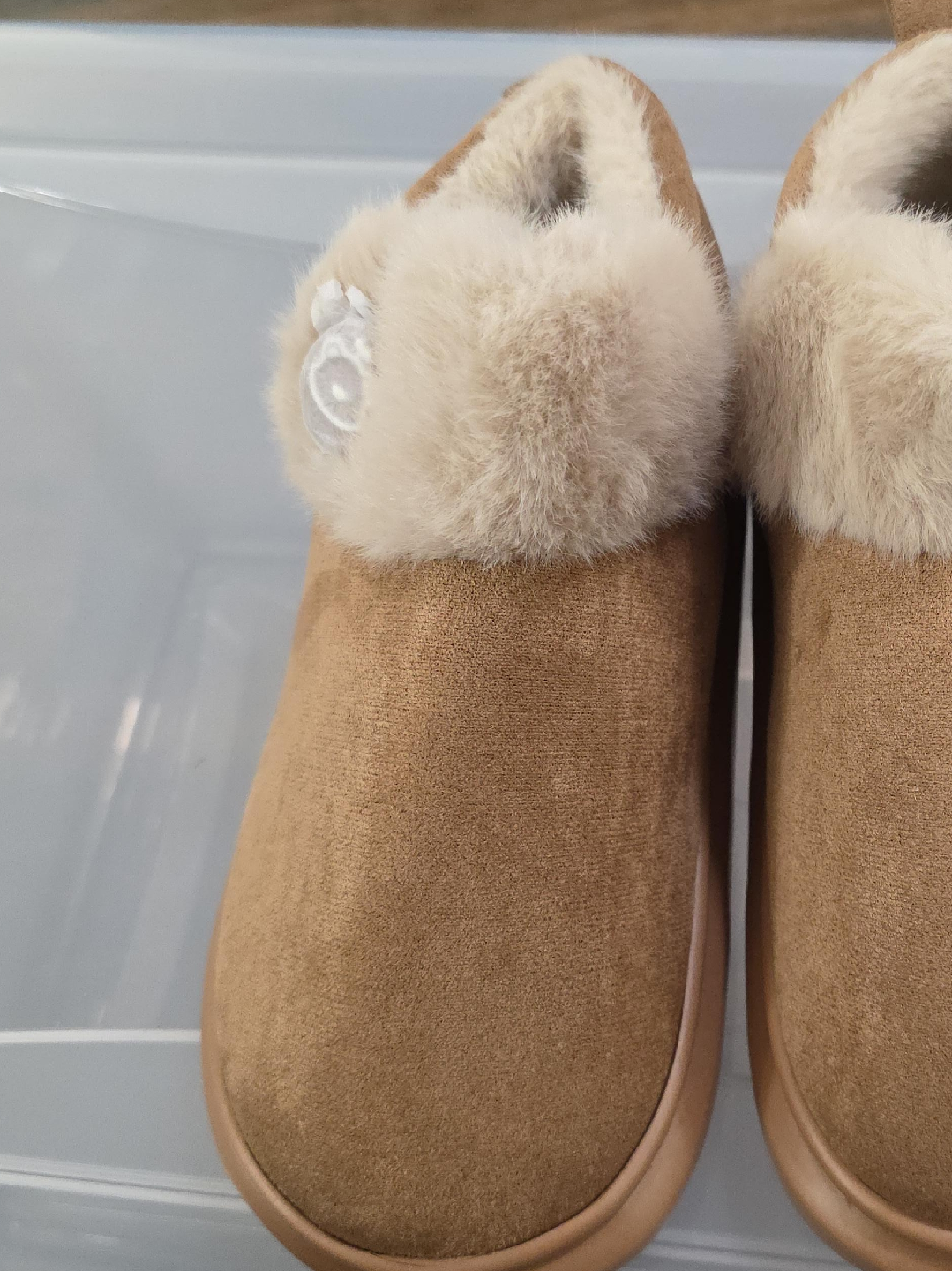 These cozy slippers are perfect for keeping your feet warm and comfortable around the house. They have a soft, fur-trimmed edge and a cute little flower detail. The brown colour is neutral and goes with everything. They're in great condition and ready for a new home!