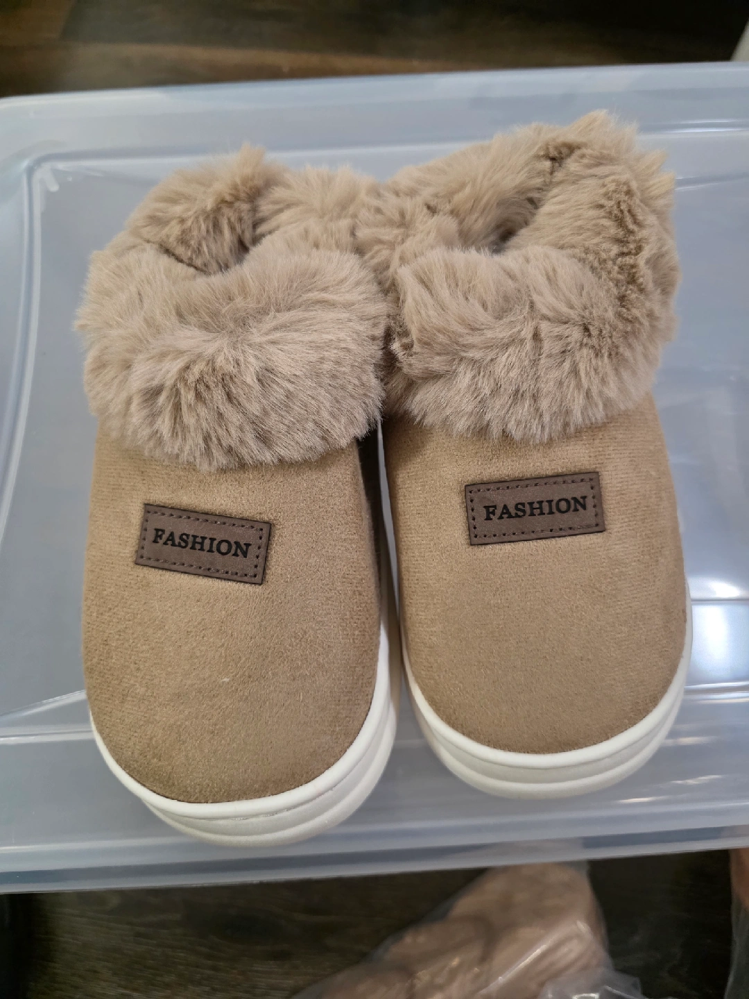 These cozy beige slippers have a soft fur trim, perfect for keeping your feet warm and comfy around the house! They feature a 'Fashion' brand label on the front.