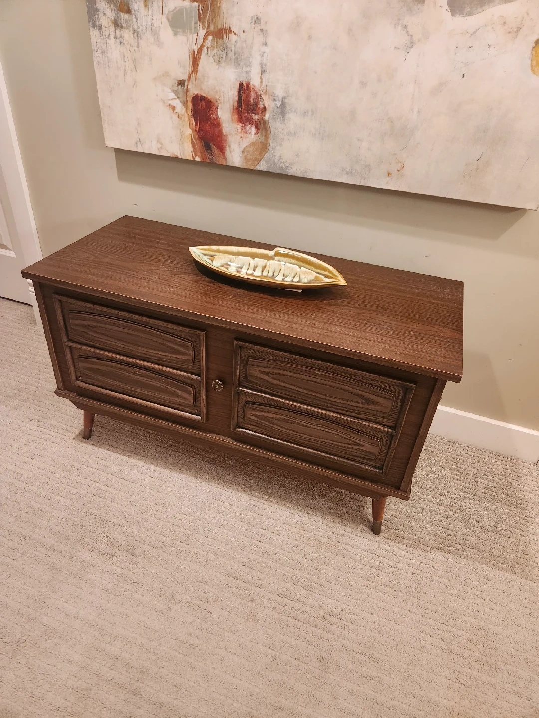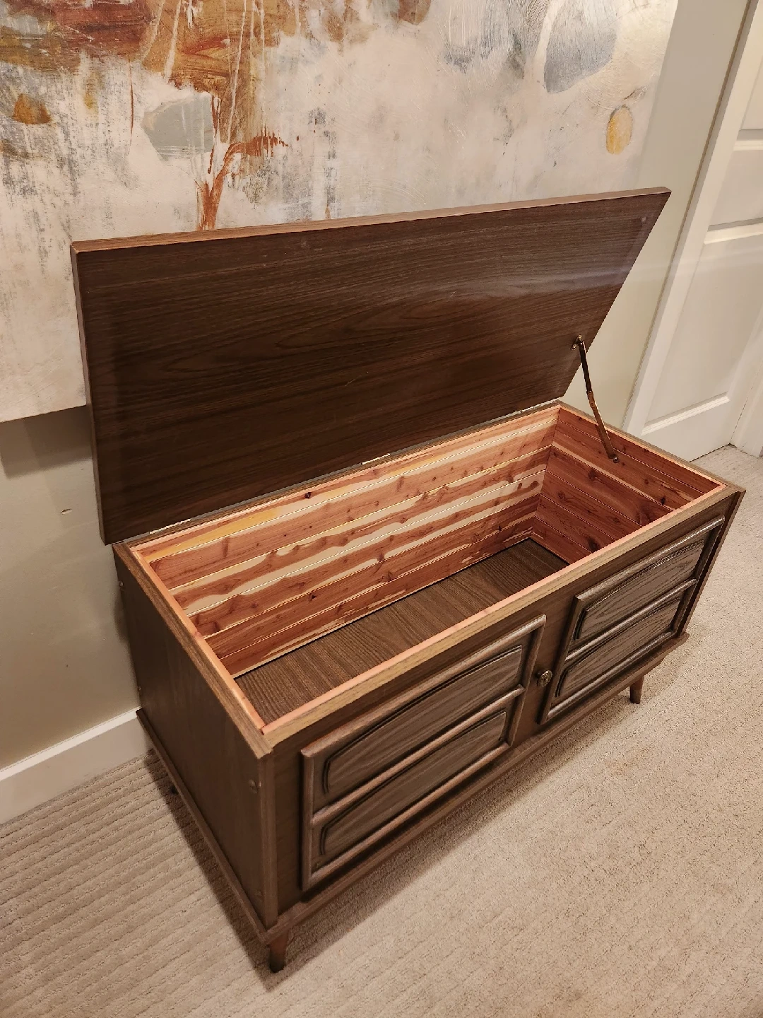 MID CENTURY MARVELOUS cedar-lined chest, can also be a coffee table or end of bed storage bench.Perfect for storing blankets or other items. The cedar lining helps to keep things fresh and protected from moths. surface measures 17.5x 39.5 x 23 high.
