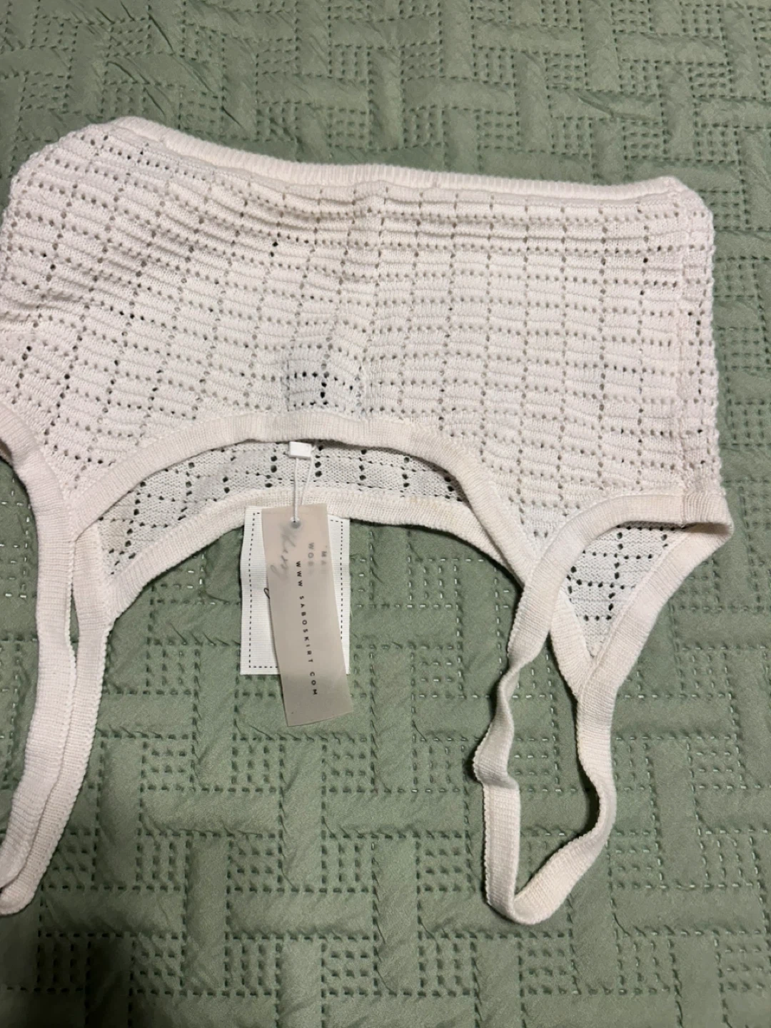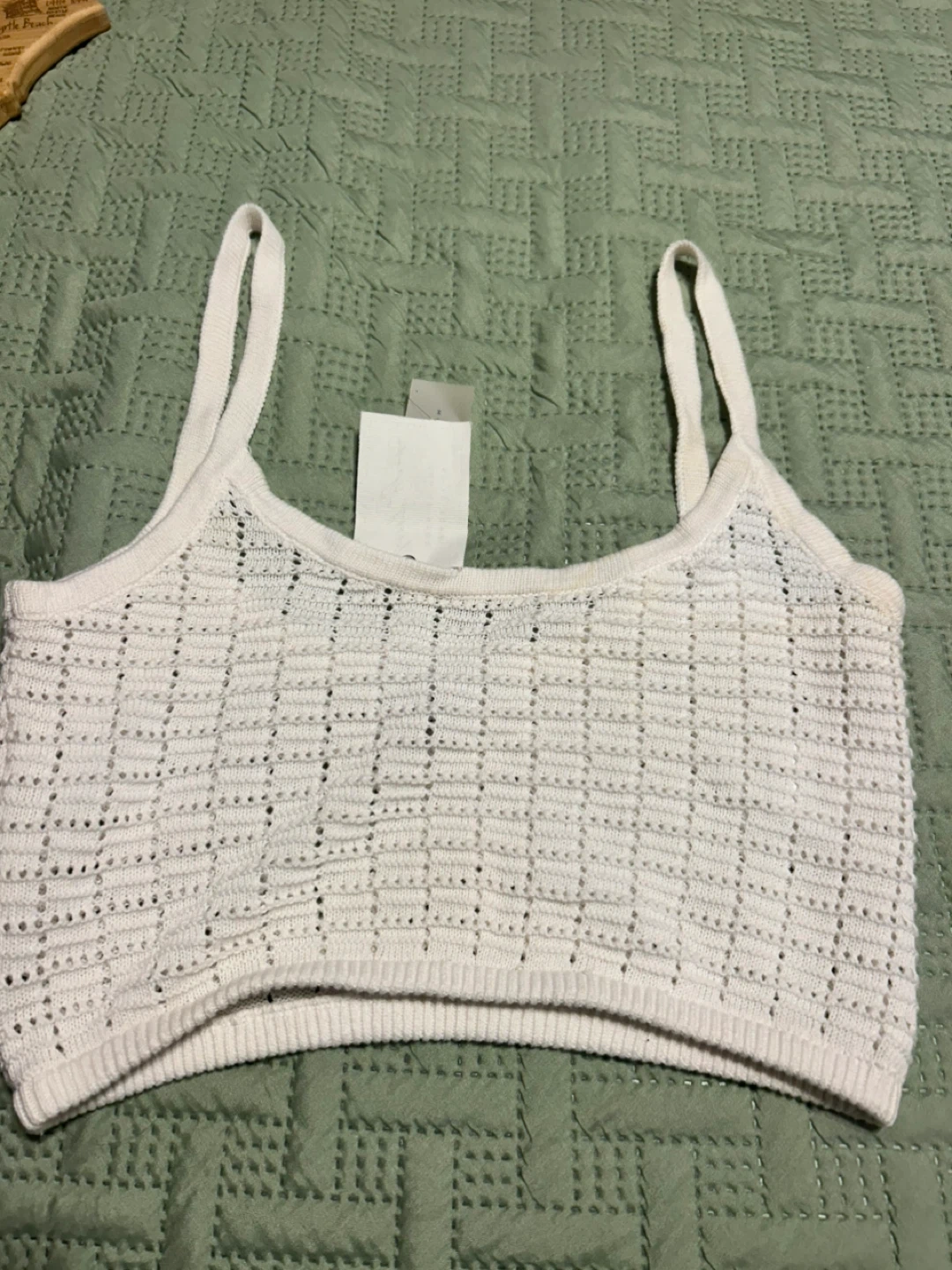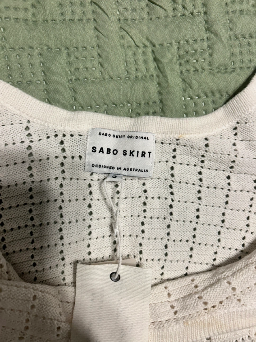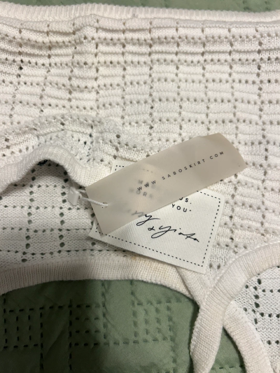Here's a Sabo Skirt original knit crop top! It's a beautiful white color and features a unique knit design. Perfect for layering or wearing on its own