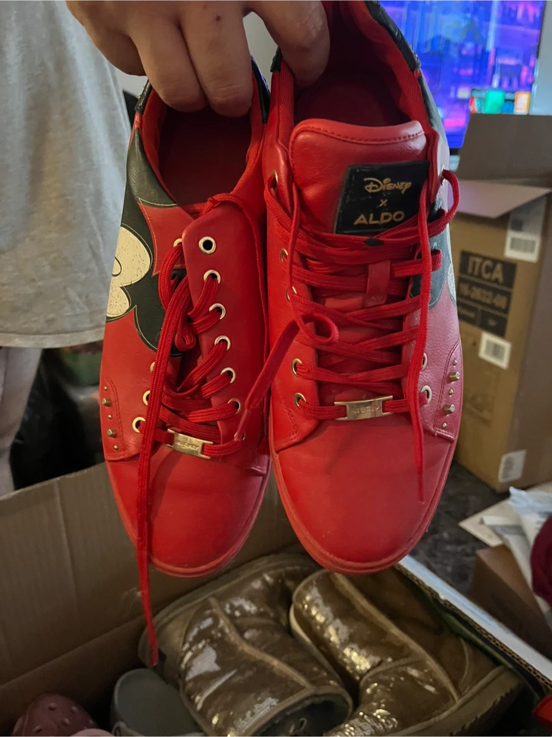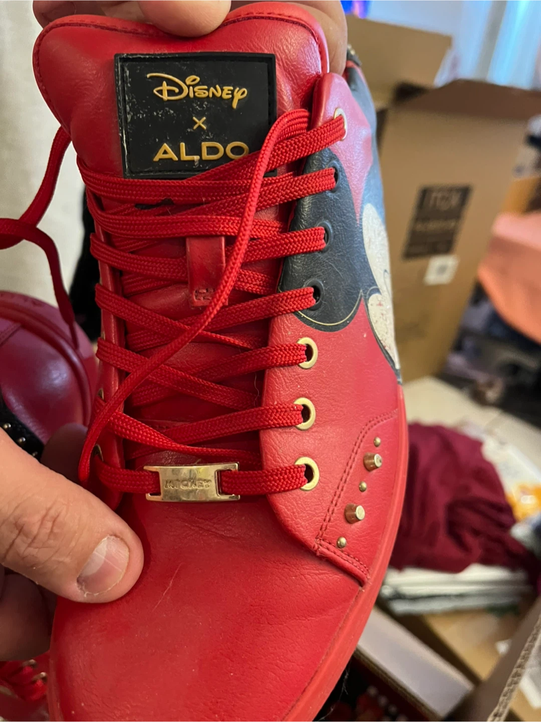 Selling a pair of Disney x Aldo sneakers featuring Mickey Mouse! They're in gently used condition and super cute. The shoes are red with black and white Mickey Mouse details.