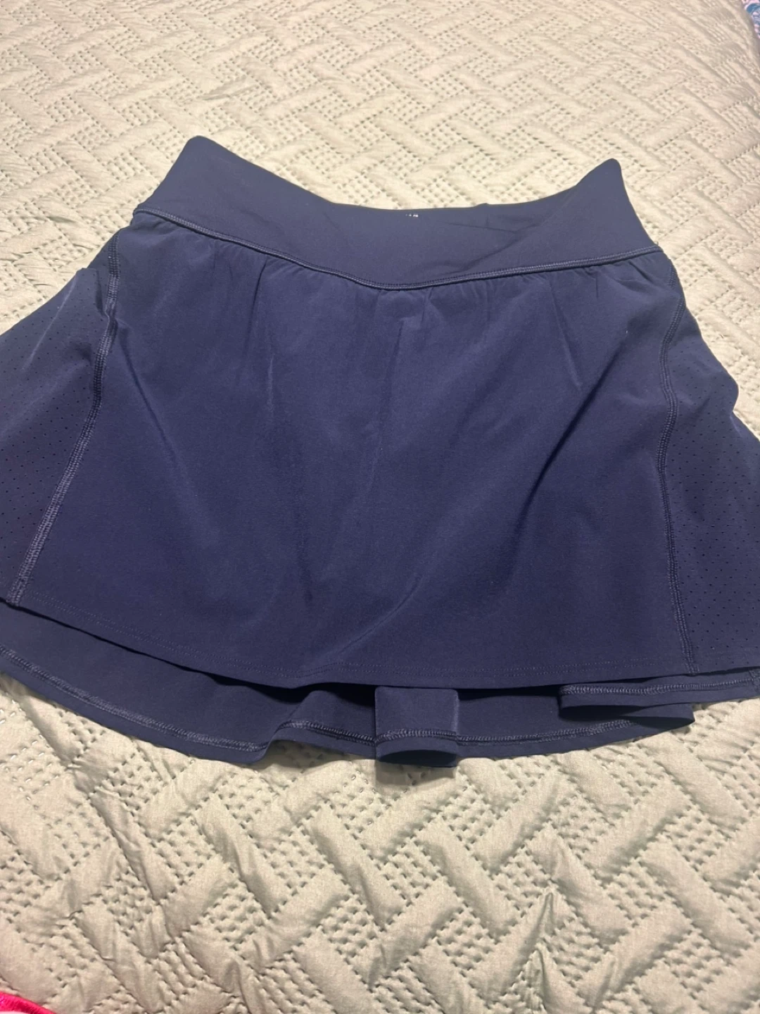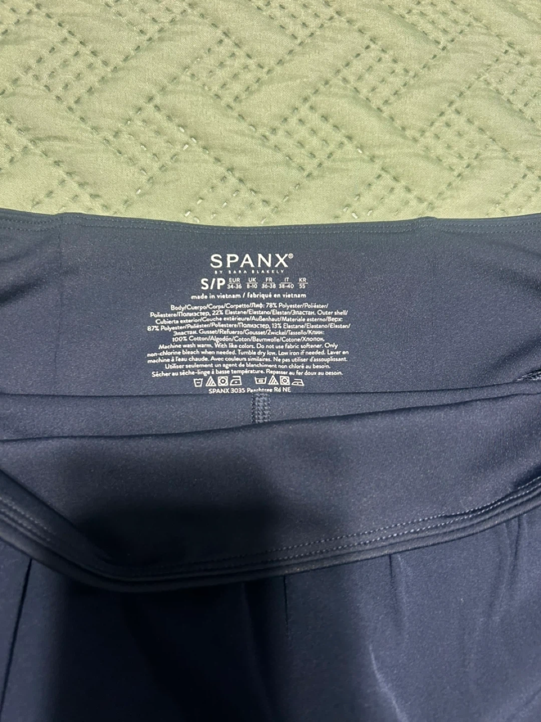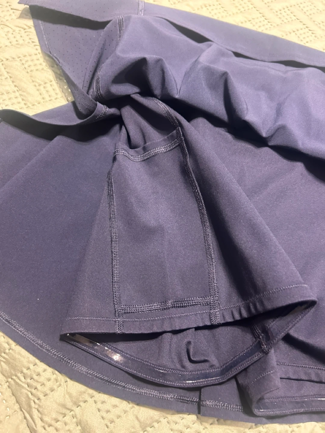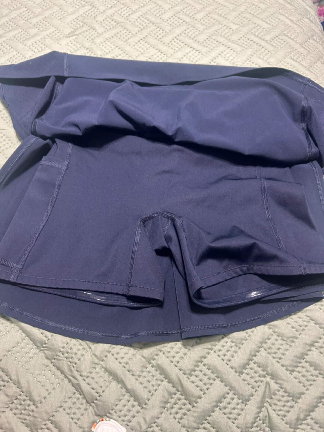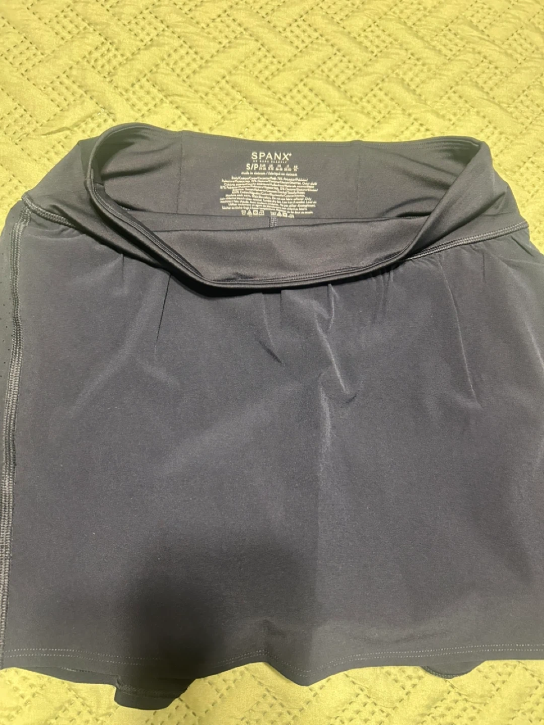 Selling a Spanx pleated tennis skirt in size small. It's a stylish and comfortable skirt perfect for tennis or everyday wear. The skirt is navy blue and made of a blend of polyester and spandex. It features a built-in short and a pleated design. Great condition!