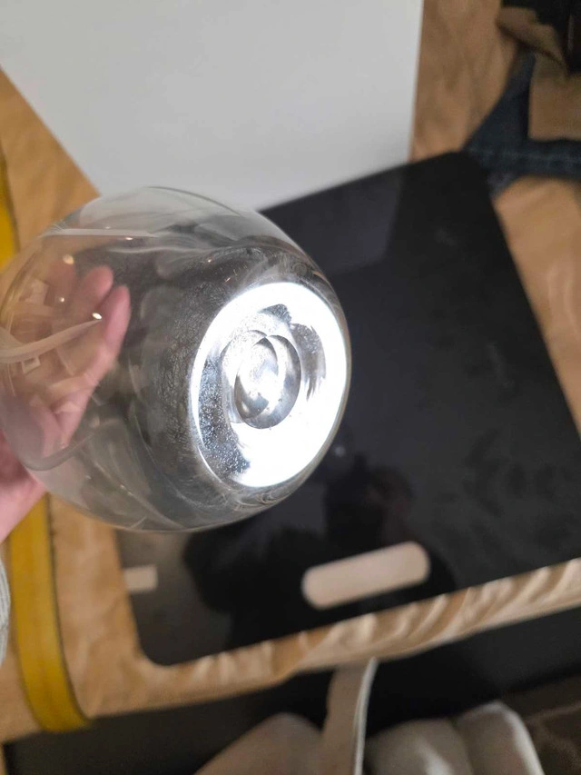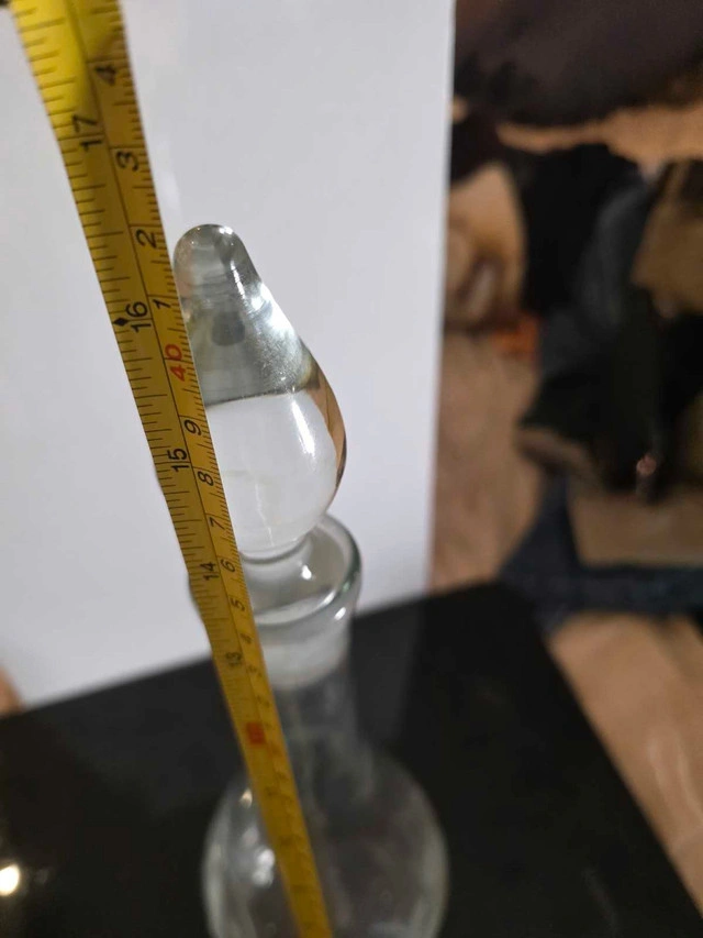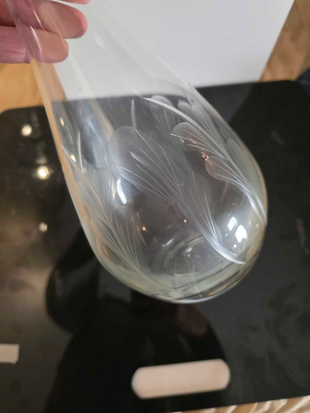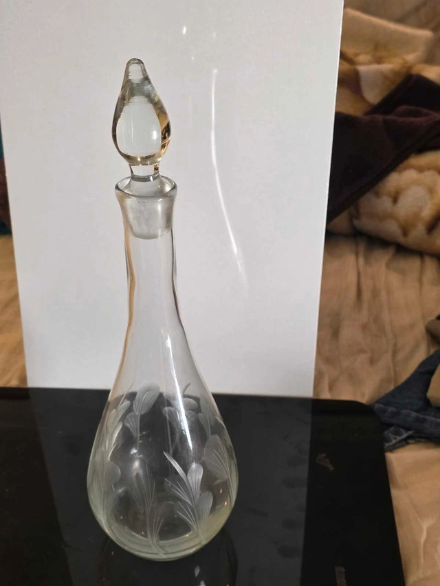 Add a touch of elegance to your home bar with this vintage glass decanter. It's in good condition and features a lovely etched design. The decanter stands approximately 16 inches tall and appears to hold approximately 750ml. This piece would be a perfect addition to any glass collection, or as a standalone decor piece. Specifications: * Height: Approximately 16 inches * Material: Glass * Design: Etched floral pattern Looking to class up your spirits? This decanter might just be the ticket! But remember, if the ad's up, it's still available!