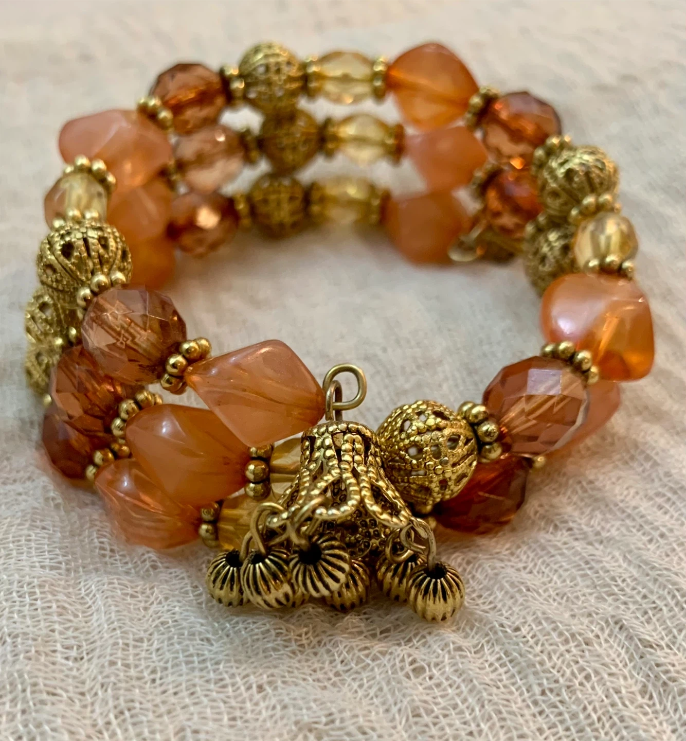 This is a beautiful beaded bracelet with peach and gold accents. It's in great condition and would be a lovely addition to any outfit!