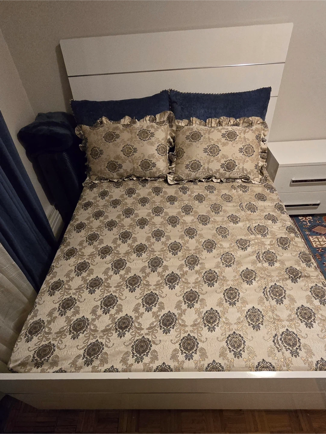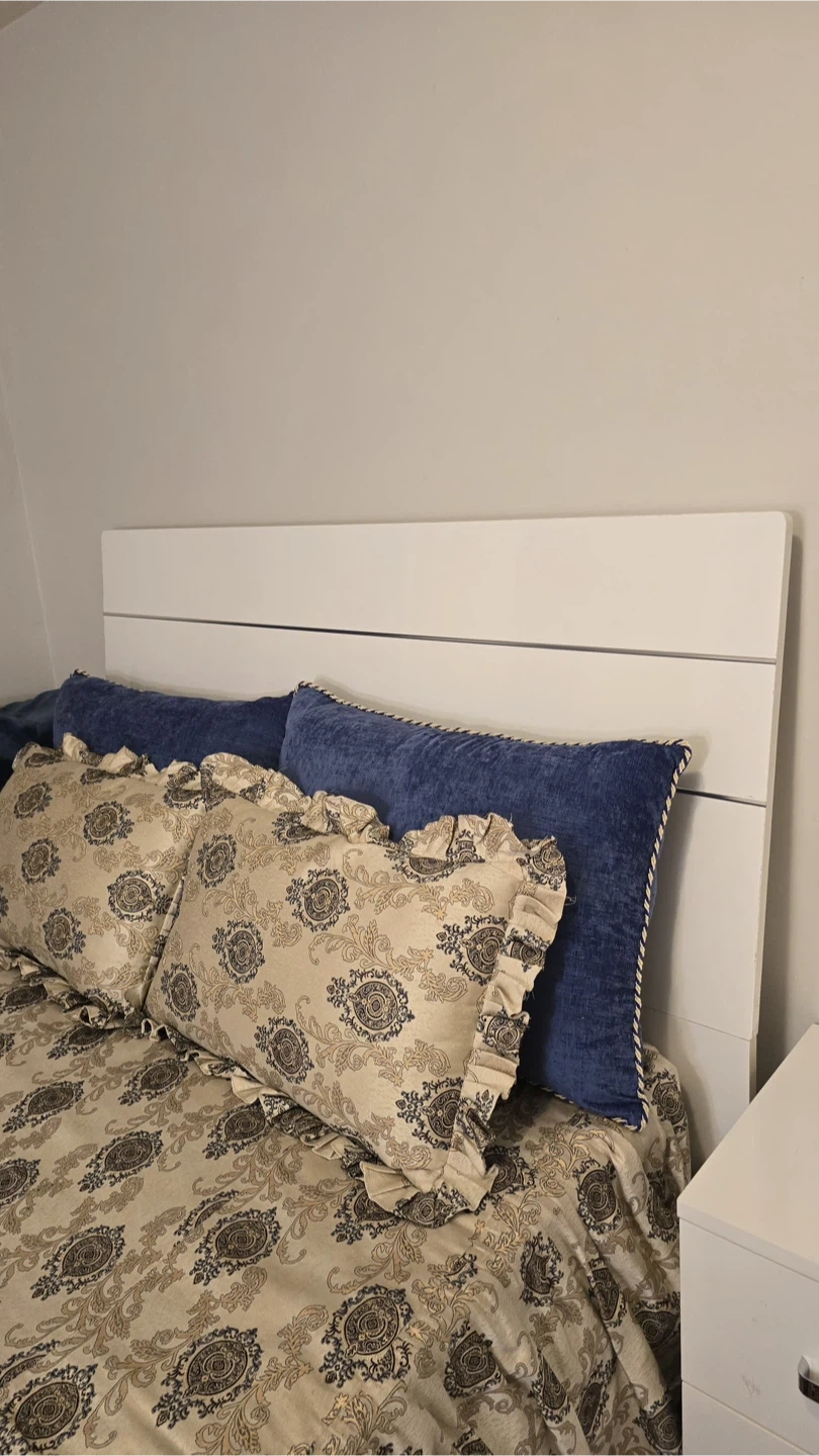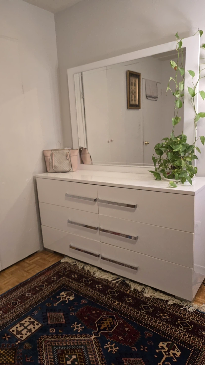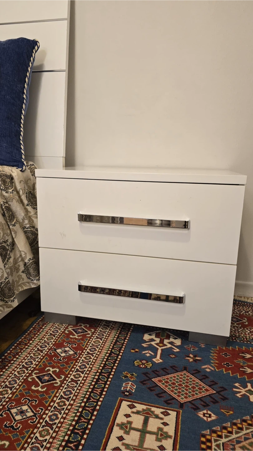 Selling a bedroom set including a bed, dresser with mirror, and a nightstand. The set is in great condition and features a modern design with a white piano finish and silver accents. Perfect for updating your bedroom space!