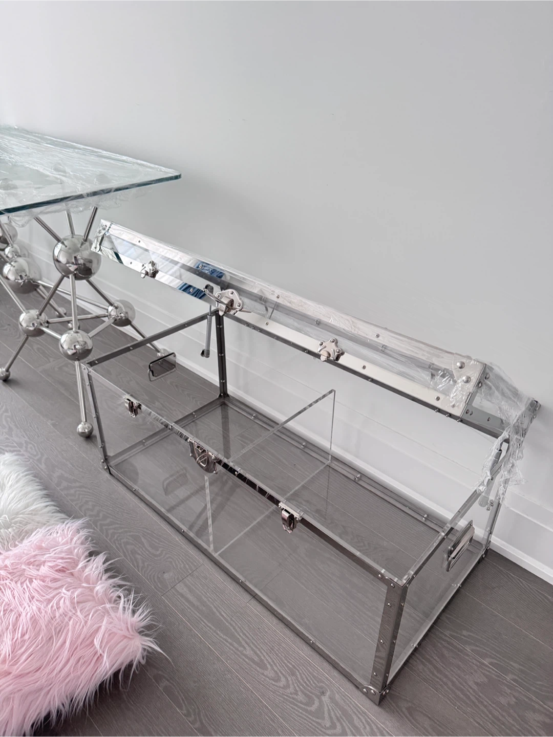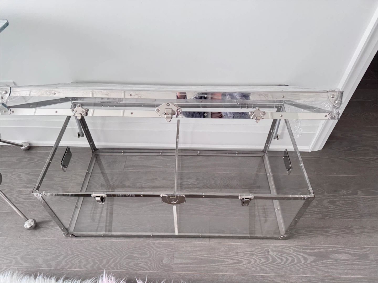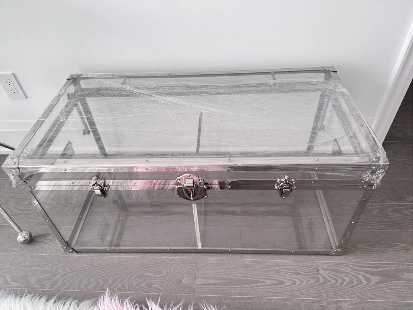 Selling a stylish acrylic trunk coffee table! It's in great condition and would be a lovely addition to any living space. It's a unique piece that combines functionality with a modern aesthetic!