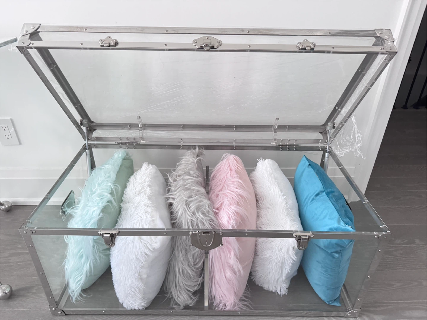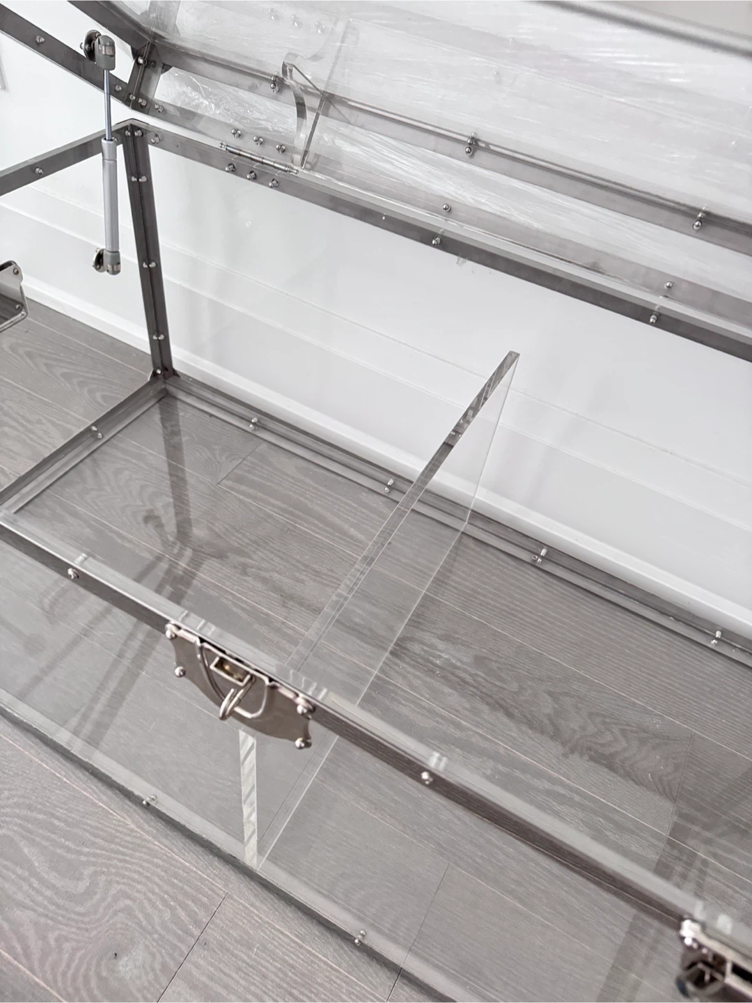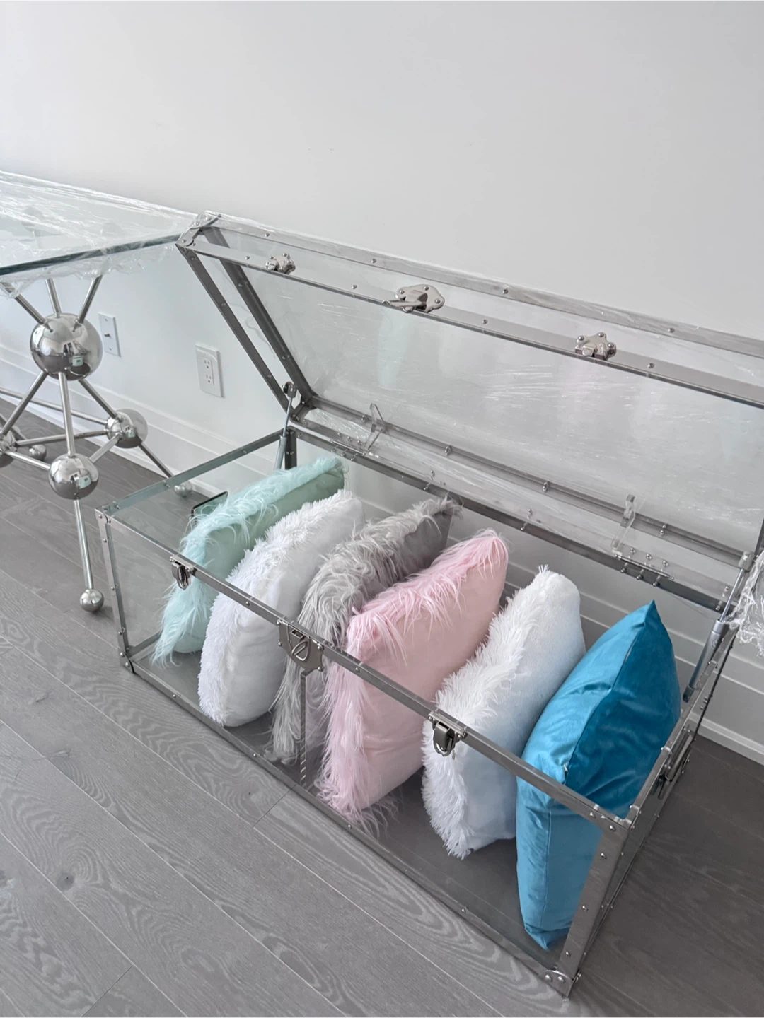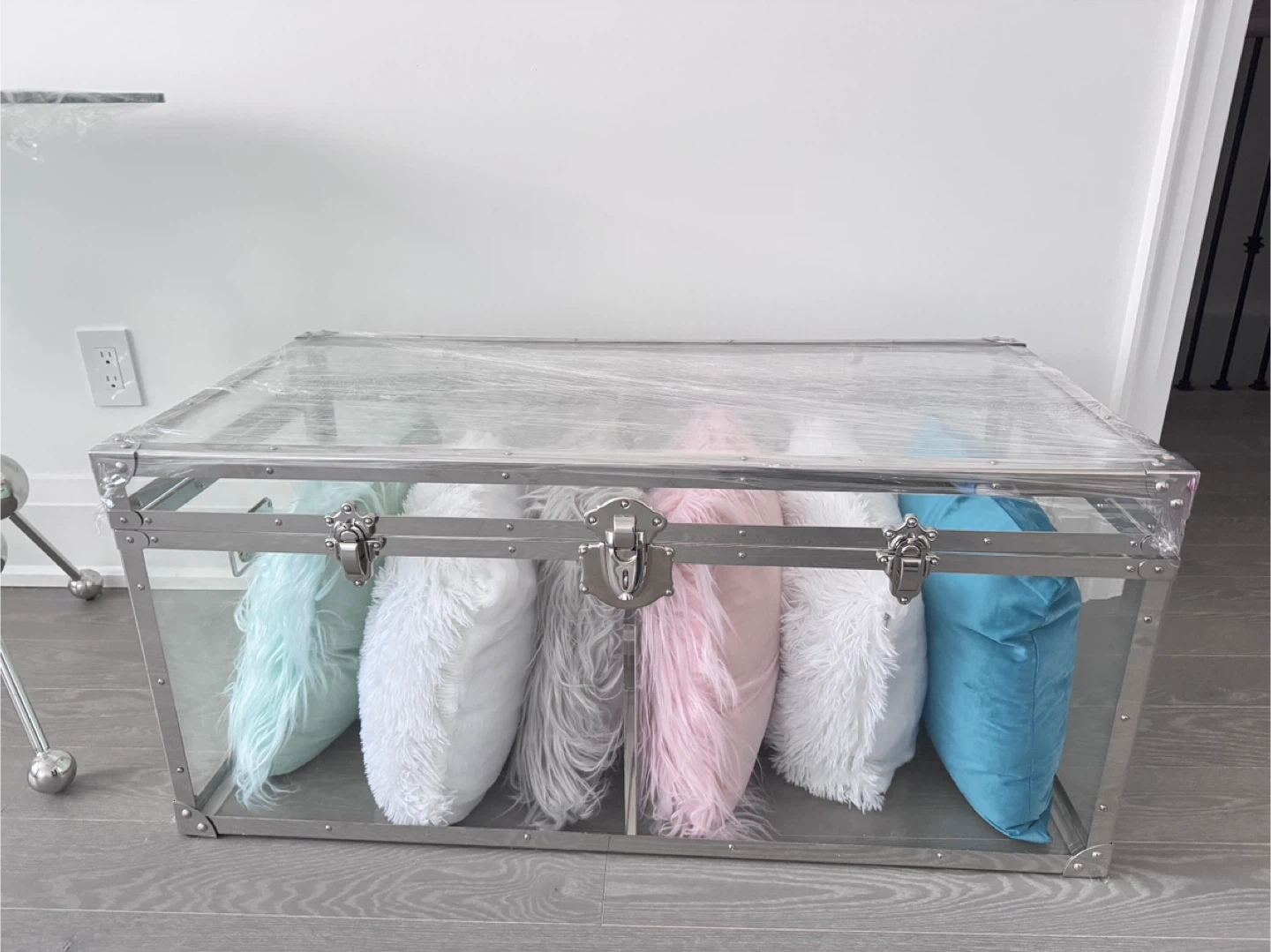 Selling a stylish acrylic trunk coffee table! It's in great condition and would be a lovely addition to any living space. It's a unique piece that combines functionality with a modern aesthetic!