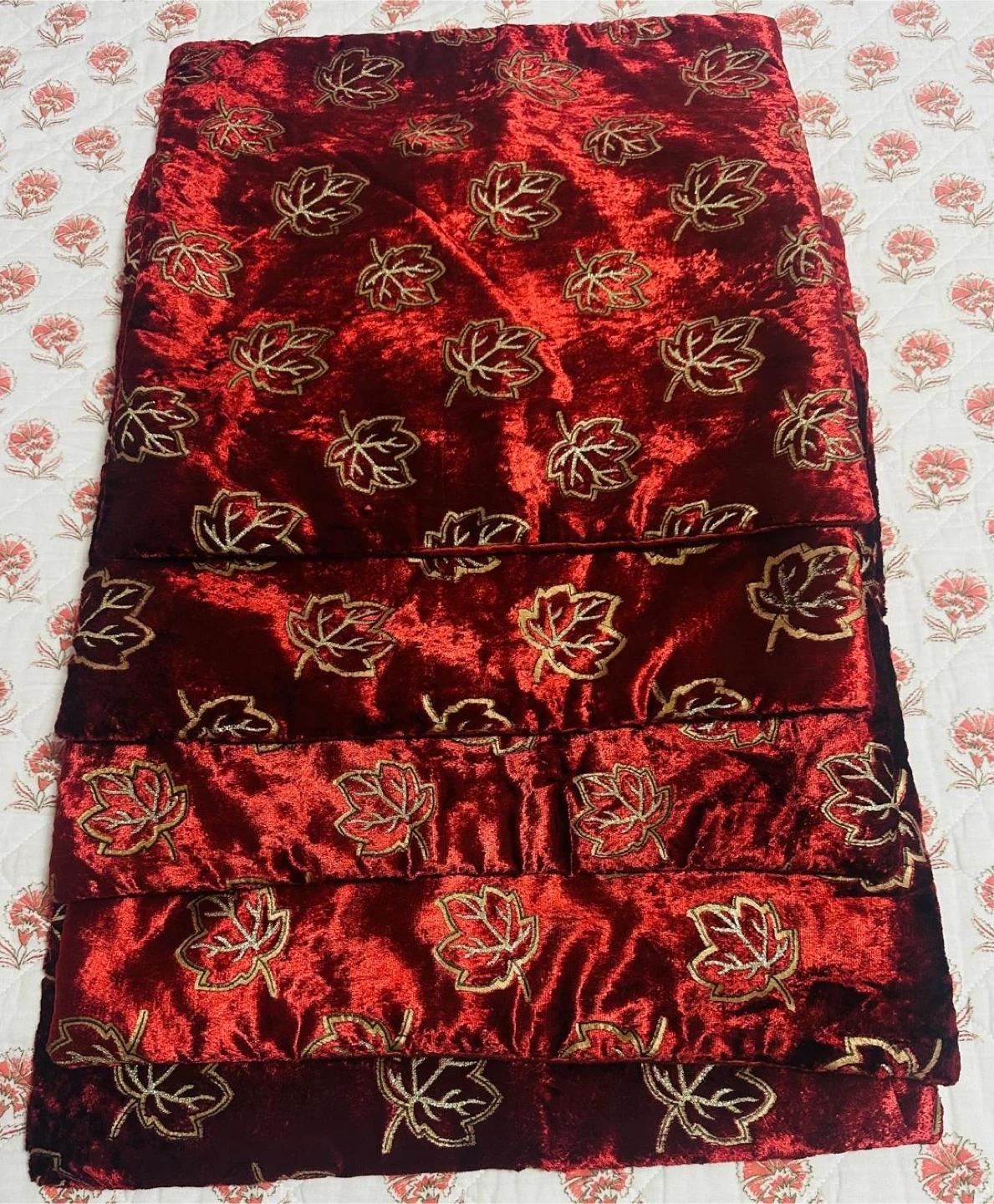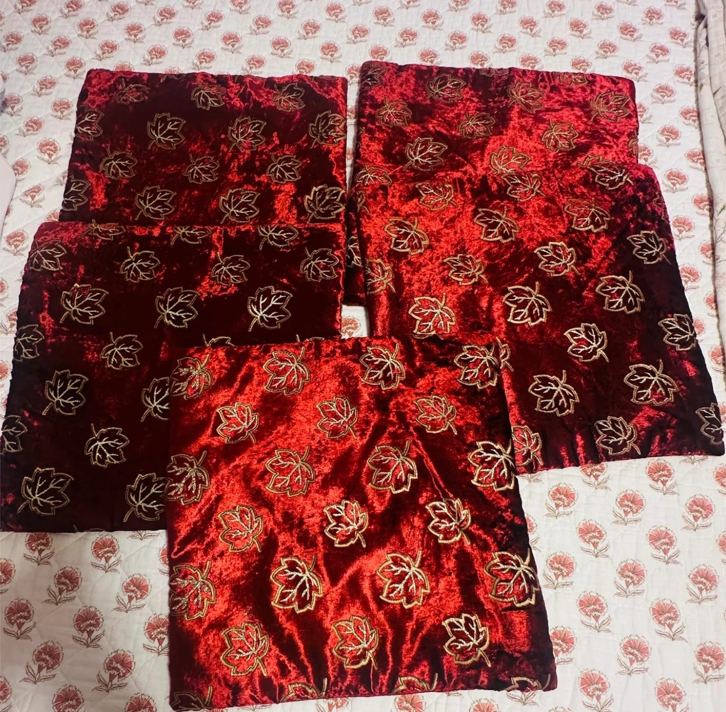 Selling a set of 5 pillow covers. They feature a beautiful red velvet material with a gold leaf pattern. These covers will add a touch of elegance to any room! Size is 16* 16