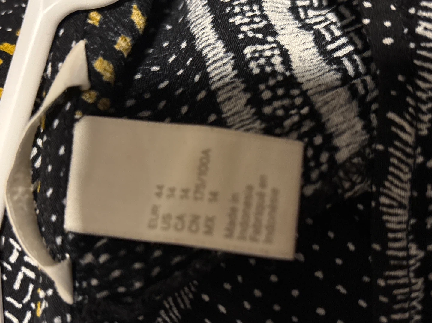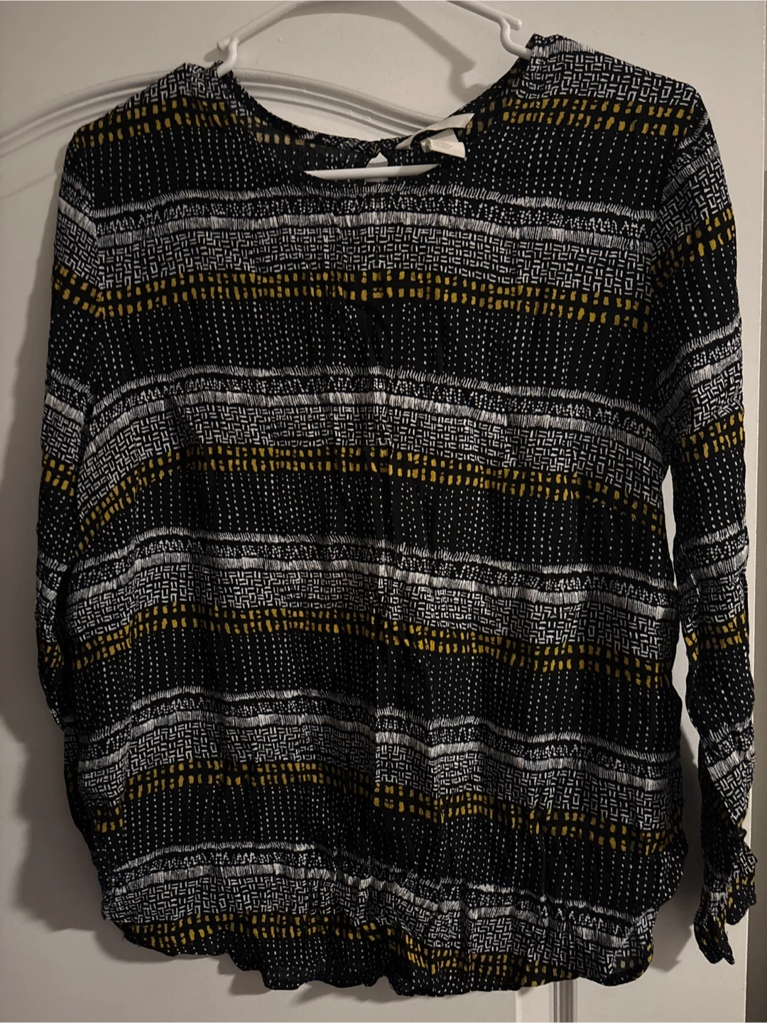 Selling a cute H&M blouse with a unique black, white, and yellow pattern! It's a size 14 and in great condition. Perfect for adding a stylish touch to your wardrobe