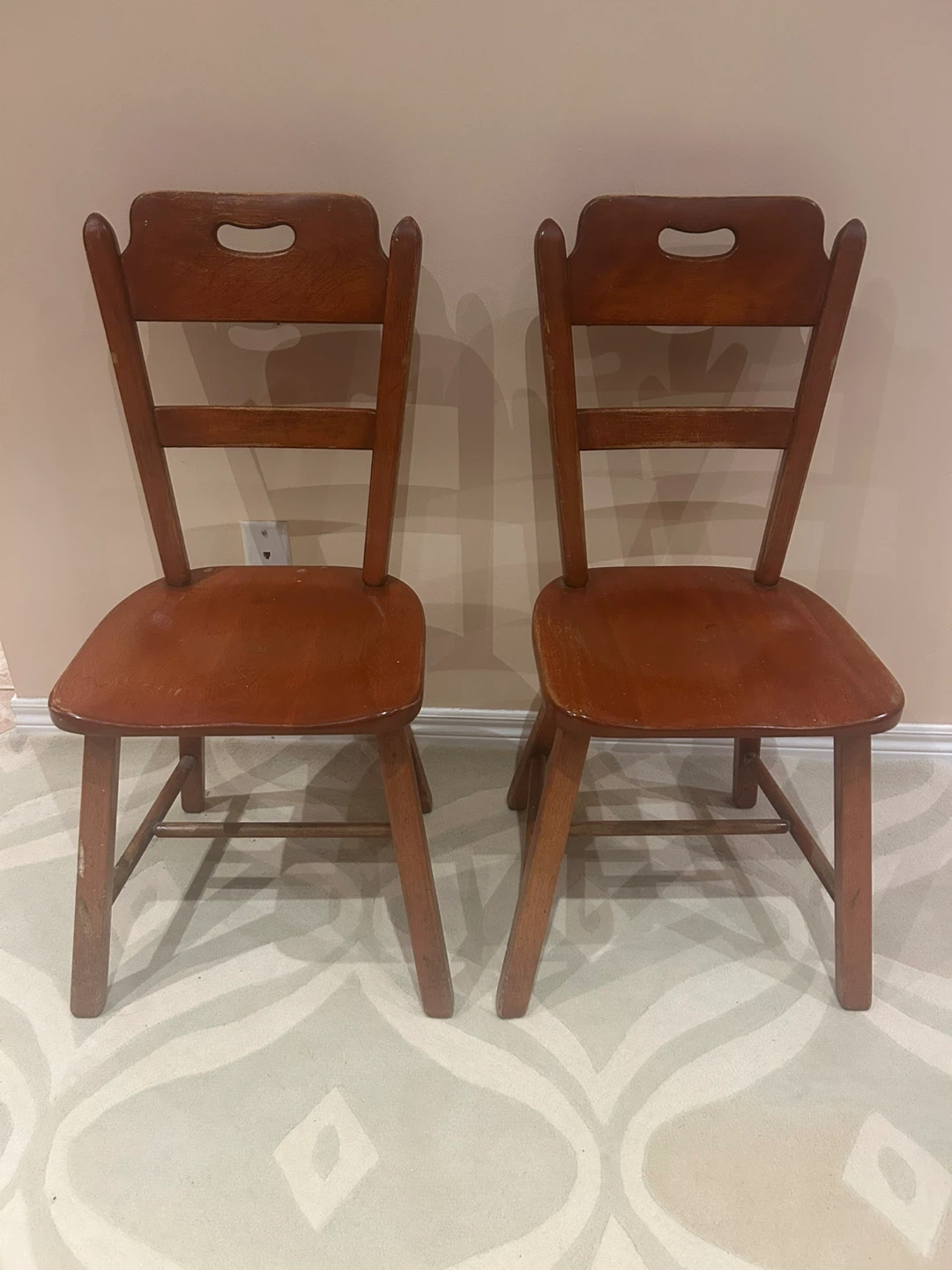Selling a set of two wooden chairs. They have a classic design and are perfect for a dining room or kitchen. The chairs are in good condition with some signs of wear, adding to their vintage charm
