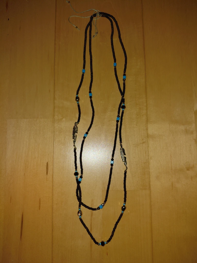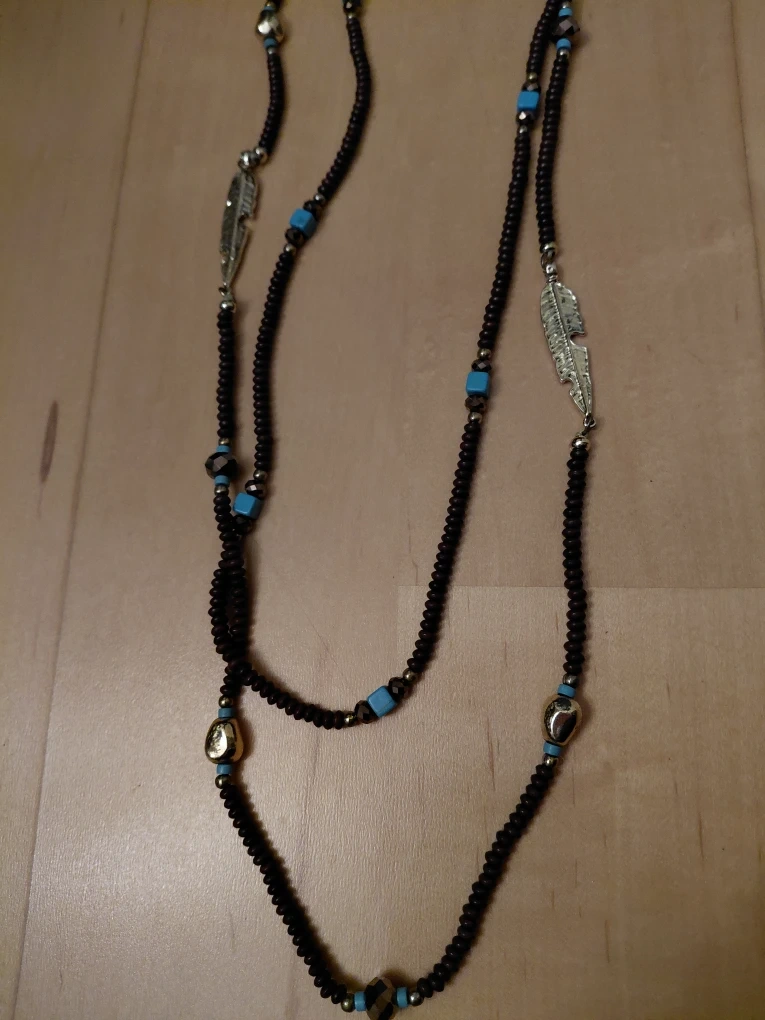 Selling a beautiful beaded necklace from Birdie's Nest. It features black beads with turquoise accents and silver feather charms. Comes with the original box!